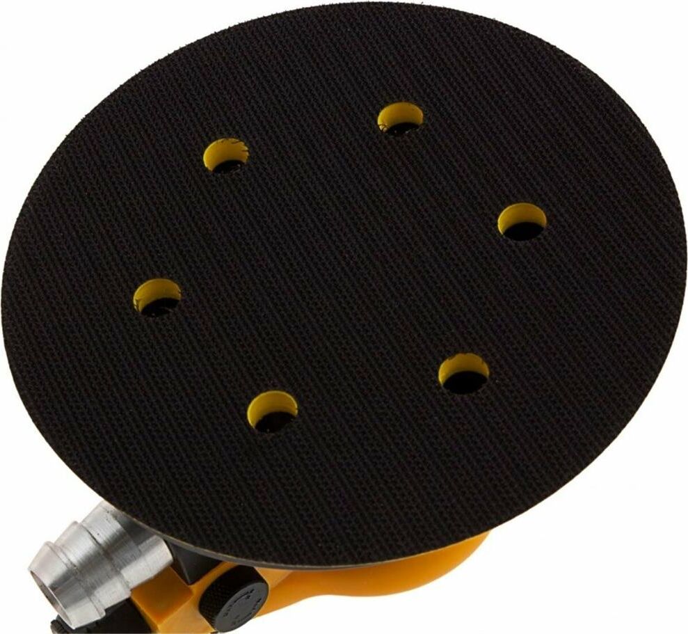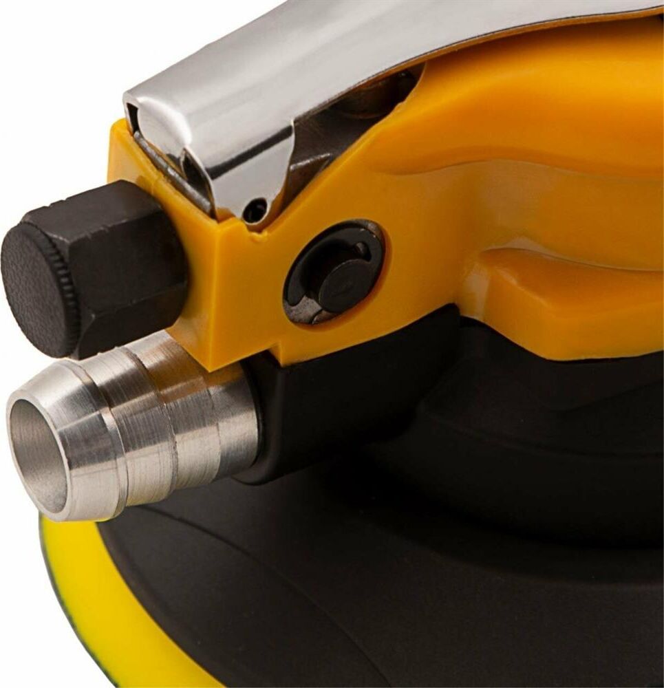 Пневматическая эксцентриковая шлифовальная машина Denzel EPG150 57476 с амплитудой 5 мм развивает скорость вращения 10000 об/мин при среднем расходе воздуха 160 л/мин. Этого достаточно для эффективного шлифования, зачистки и выравнивания любых поверхностей (древесины, металла, пластика и т.д.). С помощью машинки можно без усилий подготовить материал любой твердости к покраске или отделке, выровнять металл перед сваркой. А при использовании более мягкой насадки получится сделать любую поверхность абсолютно гладкой и придать ей дополнительный блеск.Орбитальная шлифмашина предназначена для работы при давлении 6,3 бар, расход воздуха не превышает 200 л/мин. Во время работы не забывайте использовать специальное масло ISO 46, которое можно добавлять как напрямую в инструмент, так и с помощью блока подготовки воздуха Denzel 57469, включающего в себя лубрикатор для автоматической подачи масла.
