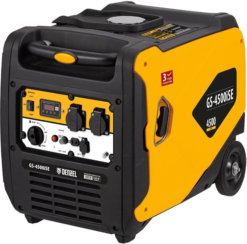 Инверторный генератор Denzel GS-4500iSE 94714 мощностью 4,5 кВт оснащен электростартером и поддерживает напряжение 230 В. Используется в качестве автономного источника электроэнергии для бытовой техники, электроинструмента, осветительных приборов, незаменим в загородном доме. Для подключения потребителей предусмотрено 2 розетки переменного тока 230 В/16 А. Клеммы постоянного тока 12 В позволяют заряжать автомобильные аккумуляторы, а выход USB 5 В — мобильные устройства. Генератор обеспечивает подачу электроэнергии высокого качества и оптимален для подключения чувствительных приборов: газовых котлов, цифровых устройств, серверов и т.д.Преимущества Высокий ресурс — мощный и экономичный 4-тактный двигатель и надежный альтернатор с медной обмоткой обеспечивают длительную стабильную работу.Быстрый старт — электростартер позволяет запускать двигатель одним нажатием кнопки.ECO-режим — обороты двигателя автоматически регулируются в соответствии с подключенной нагрузкой, что п