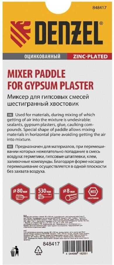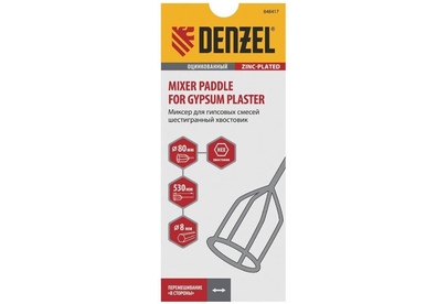 DENZEL Миксер для гипсовых смесей, 80 х 530 мм, оцинкованный, шестигранный хвостовик 8 мм 848417