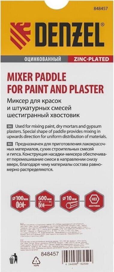 Оцинкованный миксер для красок и штукатурных смесей Denzel 848457, 100 х 600 мм, с шестигранным хвостовиком 10 мм, используется для приготовления строительных растворов. Насадка перемешивает состав снизу вверх, что позволяет добиться полной однородности готовой смеси. Защитное кольцо предотвращает повреждение емкости, в которой готовится раствор. Миксер пригодится во время строительства и ремонта.ПреимуществаНасадка изготовлена из стали и имеет прочную сварную конструкцию, что обеспечивает ей высокую устойчивость к деформации.Оцинкованный миксер устойчив к коррозии и механическим повреждениям, поэтому прослужит долго.Шестигранный хвостовик насадки совместим с дрелями и строительными миксерами средней и высокой мощности, имеющими кулачковые зажимные патроны.Благодаря шестигранной форме хвостовика насадка-миксер надежно фиксируется в патроне инструмента и не проворачивается.