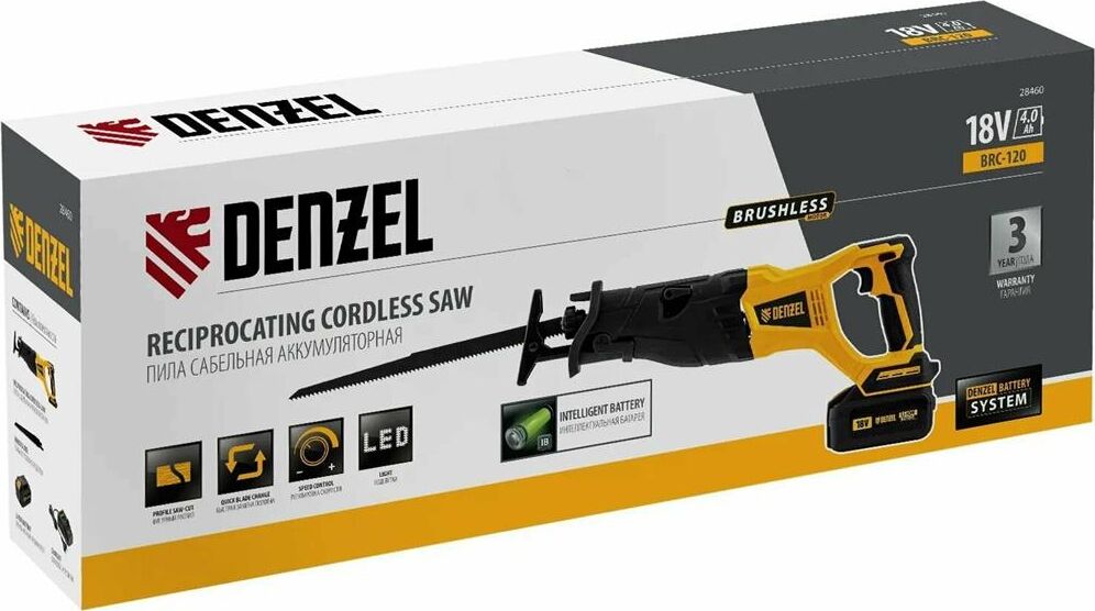 DENZEL Пила сабельная аккумуляторная бесщет BRC-120, 18В Li-Ion 28460