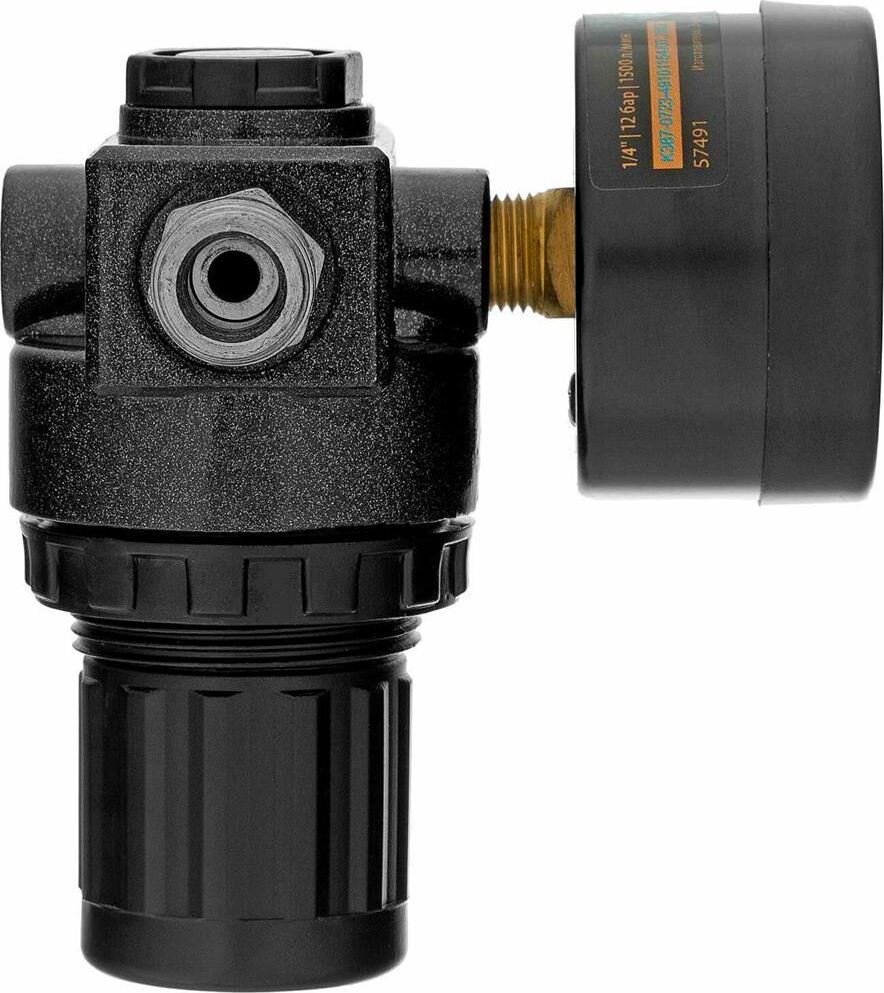 Регулятор давления с манометром Denzel R1500 57491, с присоединительным размером 1/4", имеет пропускную способность 1500 л/мин, и предназначен для установки и поддержания на заданном уровне давления до 12 бар. Подключается к компрессору и позволяет обеспечить эффективную работу пневмоинструмента.
