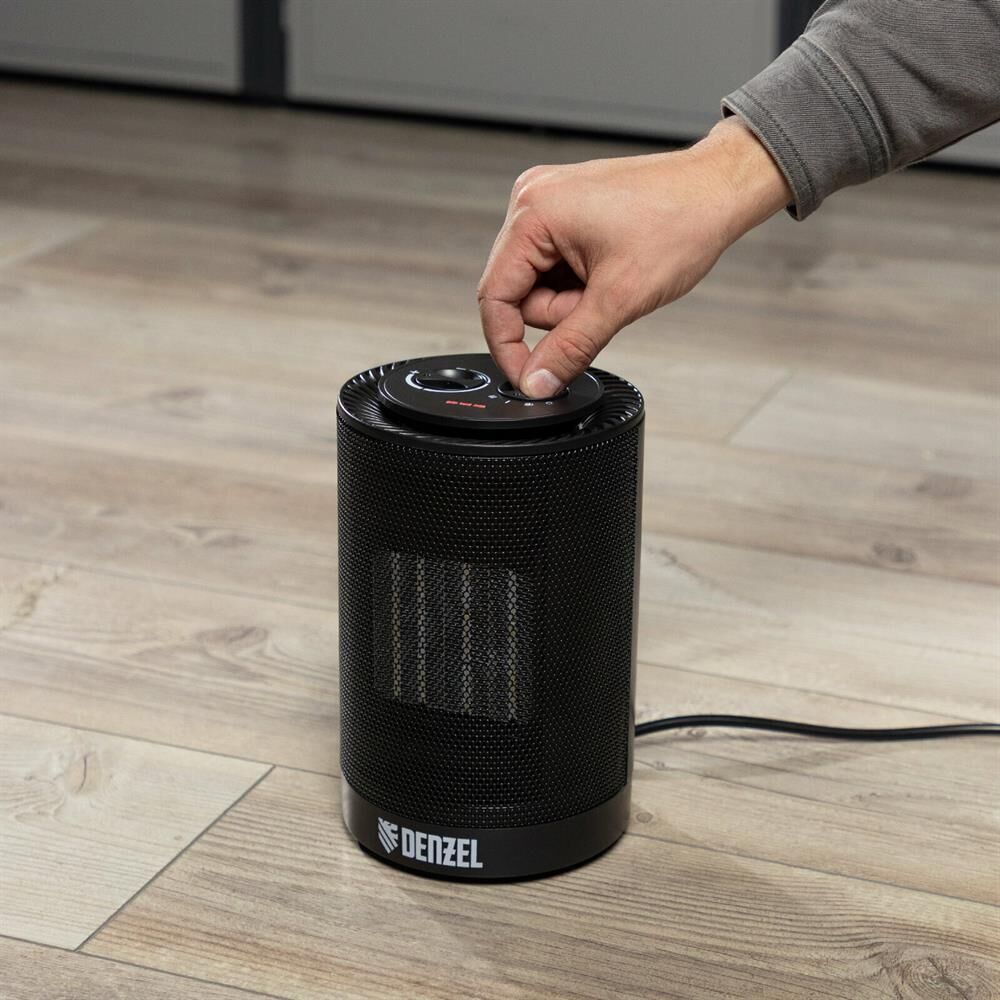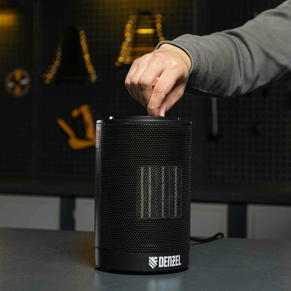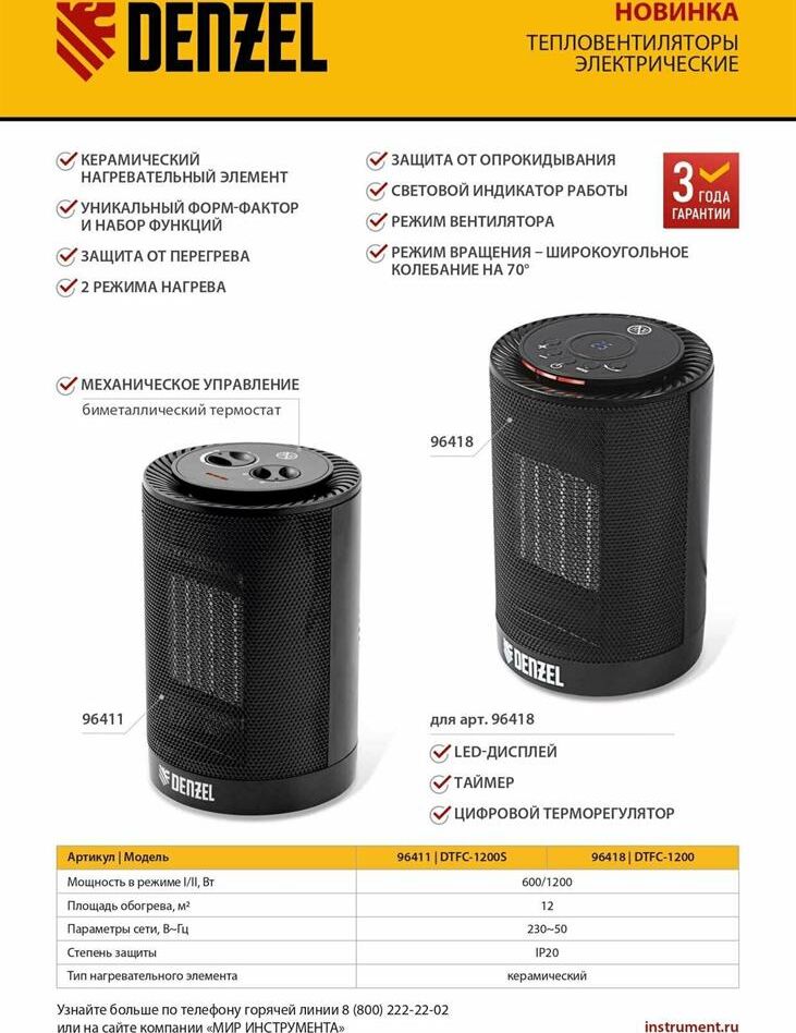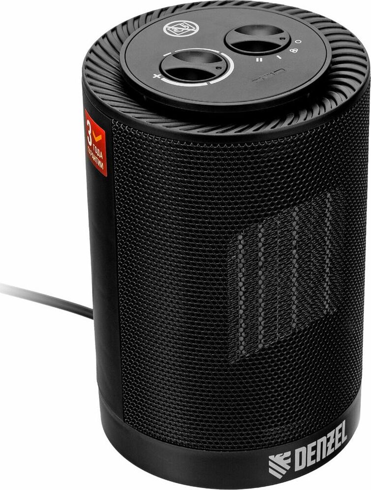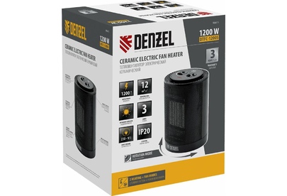Тепловентилятор Denzel DTFC1200S с керамическим нагревательным элементом и функцией вращения работает в 1 из 3 режимов: вентиляция, нагрев на мощности 600 Вт и нагрев на мощности 1200 Вт. Равномерно прогревает окружающее пространство благодаря функции осцилляции (вращения). Создает комфортный микроклимат, поскольку не сжигает пыль и не пересушивает воздух. Предназначен для обогрева помещений площадью до 12 м2, используется в бытовых целях.ПреимуществаПоддержание заданной температуры — термостат обеспечивает автоматическое включение и отключение тепловентилятора.Удобный контроль работы — на панели управления имеется световой индикатор.Режим осцилляции — данная функция позволяет менять угол направленности воздушного потока до 70° для равномерного прогрева помещения.Уникальный дизайн — DTFC1200S является единственным тепловентилятор в России в таком исполнении.Безопасность — встроенная система защиты отключает устройство при опрокидывании.Термозащита — в случае перегрева тепловентилятор автоматически выключается