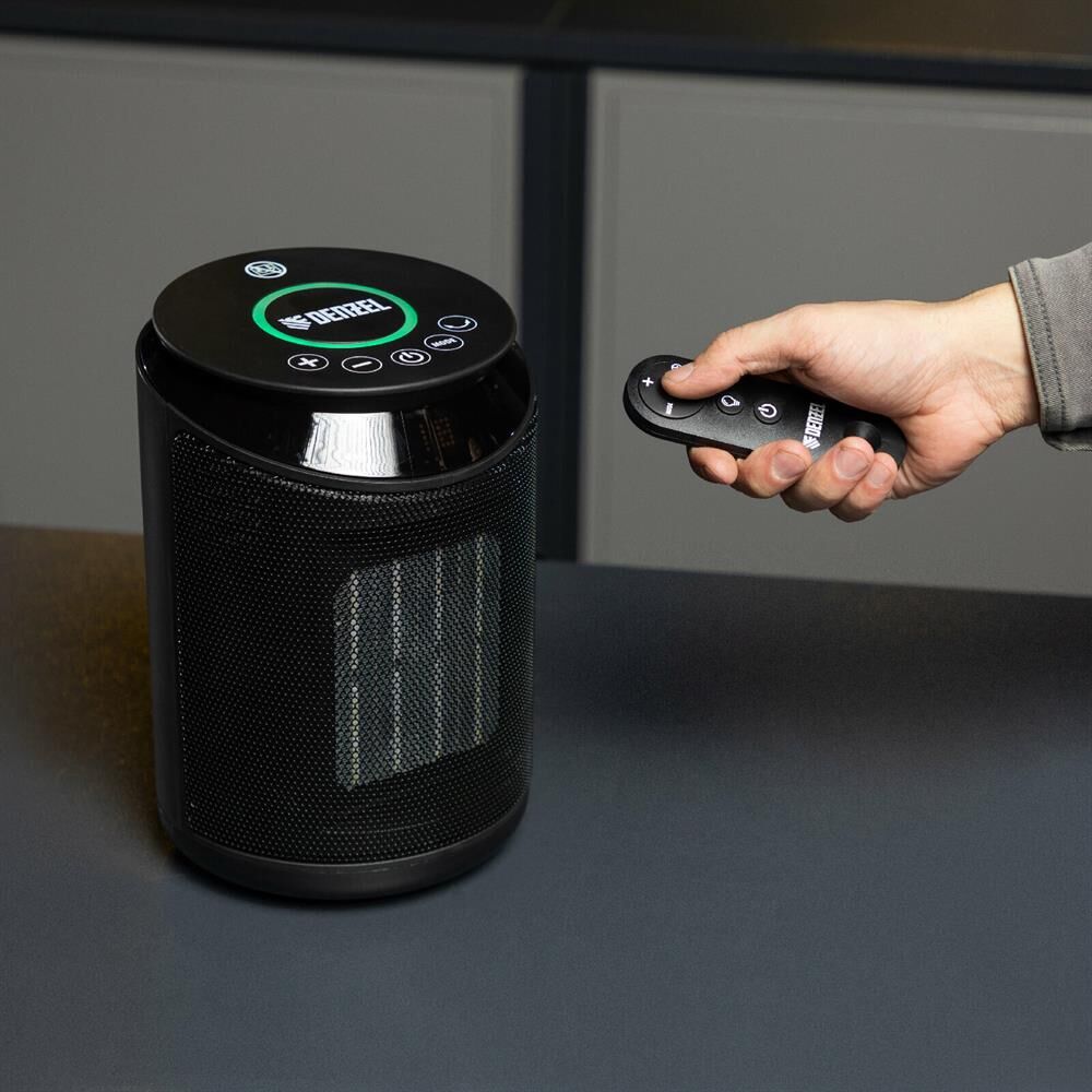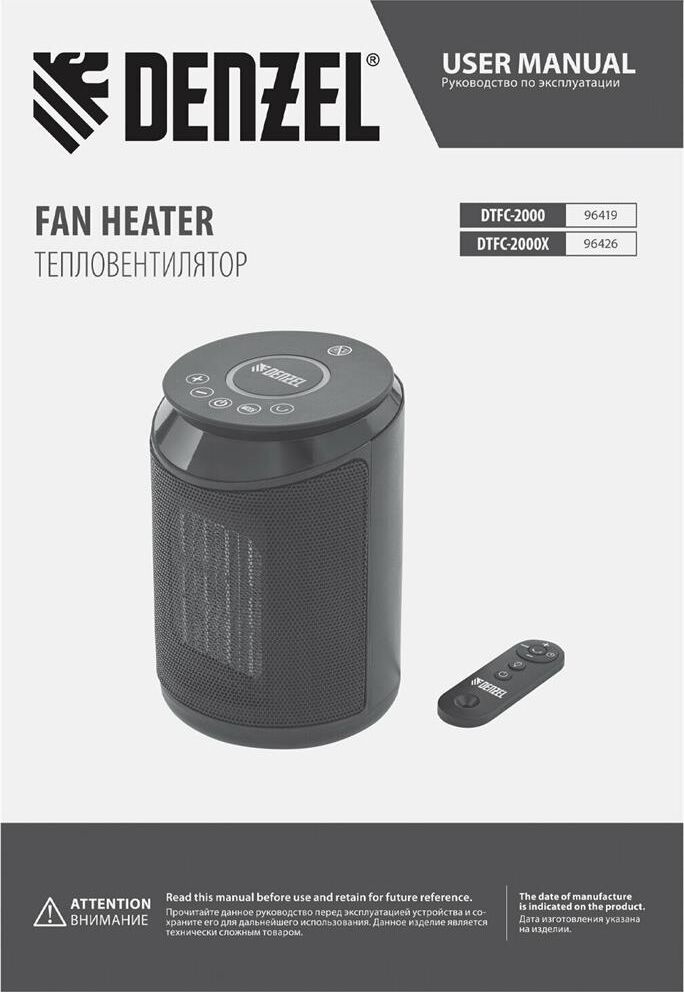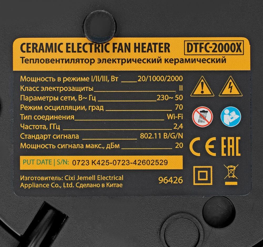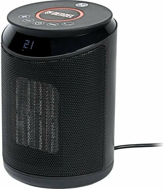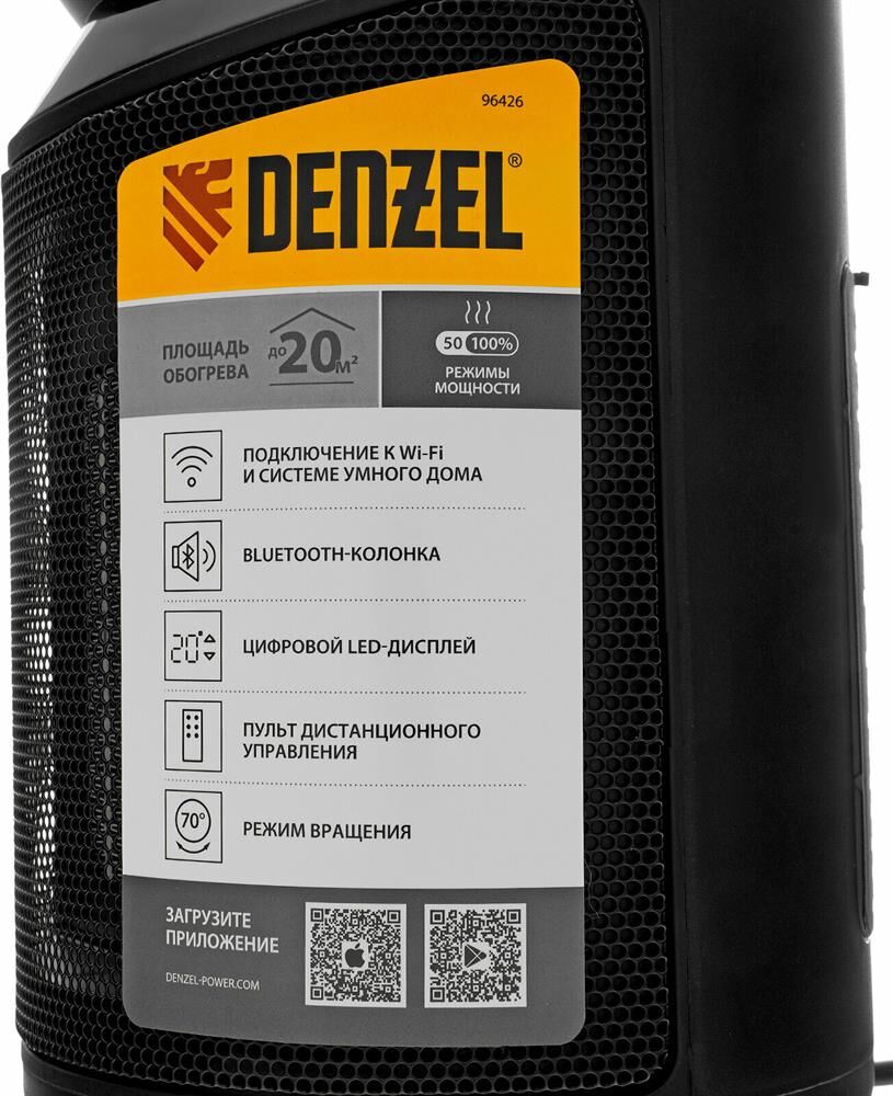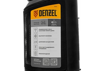 Тепловентилятор Denzel DTFC2000X 96426 мощностью 2 кВт, с керамическим нагревательным элементом, пультом и динамиком, с функцией вращения и возможностью подключения по WiFi, имеет 3 режима работы. Предназначен для обогрева и вентилирования бытовых помещений площадью до 20 м2. Позволяет поддерживать комфортный климатический режим в любое время года. Способен работать в режиме вентиляции, обогрева теплым (1000 Вт) и горячим воздухом (2000 Вт). В комплект поставки входит пульт дистанционного управления. Также можно подключить тепловентилятор к сети Интернет и управлять им из любой точки мира при помощи телефона или планшета с установленным приложением.ПреимуществаПодключение по WiFi — управлять моделью DTFC2000X можно дистанционно через приложение Smart life (в том числе устанавливать время работы).Встроенный динамик — вы можете включать любимые треки через соединение Bluetooth.Точная настройка — цифровой терморегулятор позволяет установить необходимую температуру.Режим осцилляции — данная функция позволяет меня