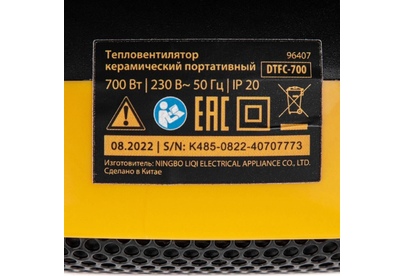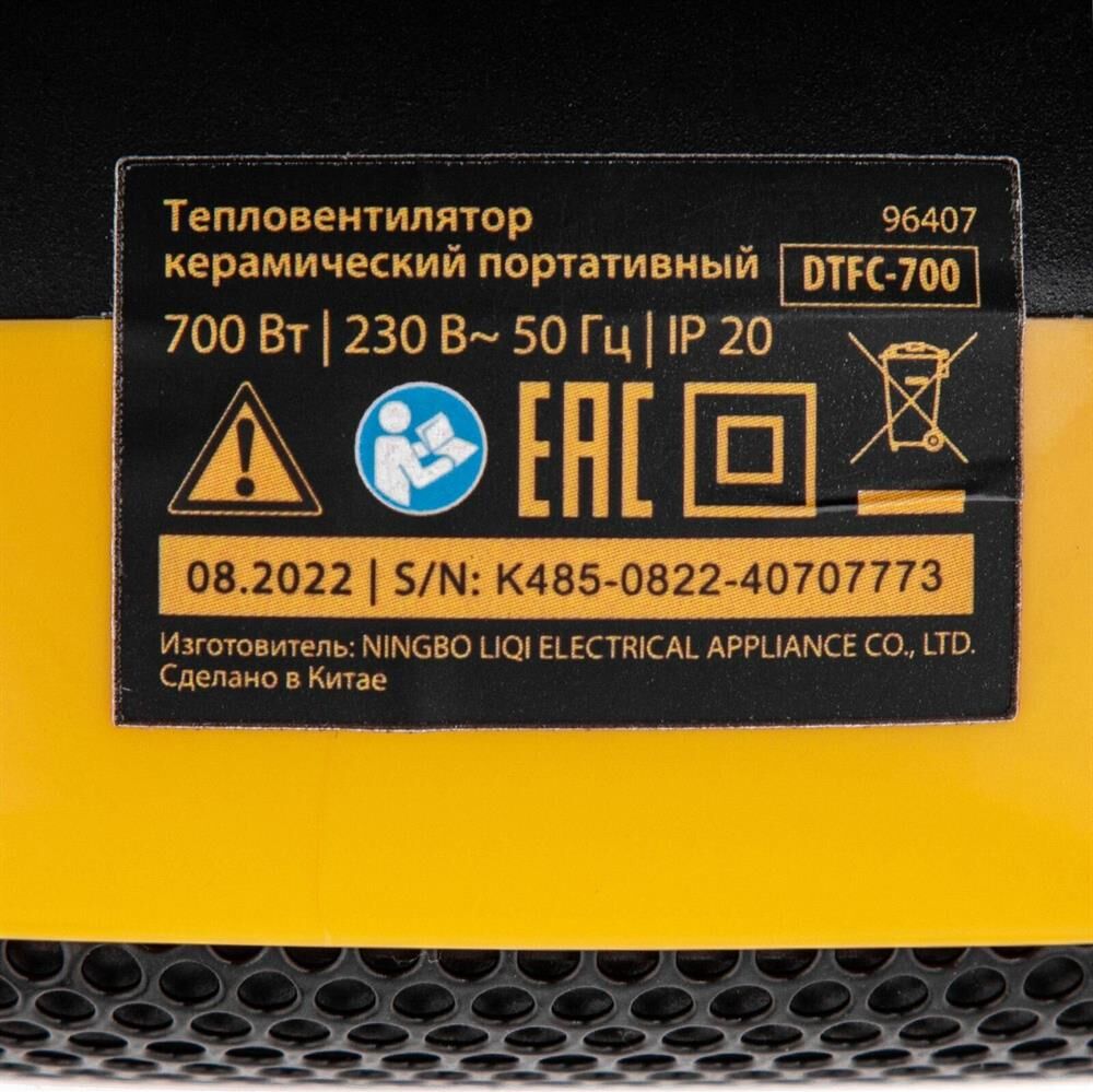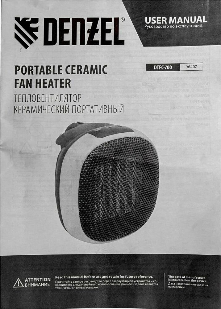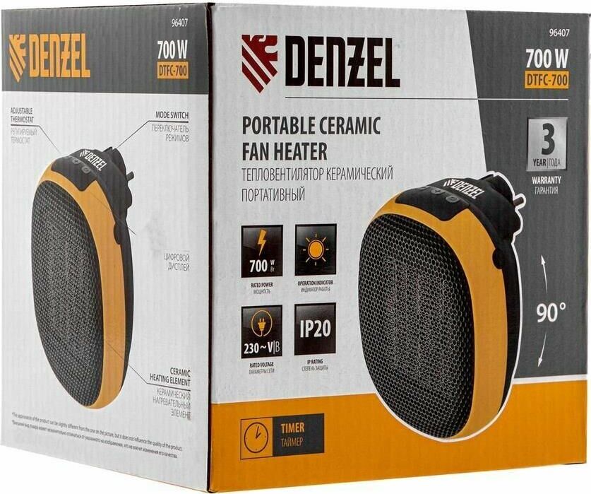 Портативный керамический тепловентилятор Denzel DTFC700 96407 номинальной мощностью 700 Вт может работать в одном из двух режимов: нагрев с максимальной либо пониженной скоростью вентилятора (тихий режим). Используется в помещениях площадью до 10 кв. м., а также подходит для локального обогрева — например, рабочего места. Прост в эксплуатации и не требует технического обслуживания. Благодаря керамическому нагревательному элементу тепловентилятор не сушит воздух и не сжигает пыль, поэтому комфортен в использовании.ПреимуществаВстроенный цифровой термостат — устройство автоматически поддерживает заданную температуру в помещении.Таймер — тепловентилятор отключается через установленный промежуток времени.Удобный контроль рабочих параметров — встроенный LEDдисплей позволяет точно указать нужную температуру и значения таймера (в часах).Эргономичность — тепловентилятор оборудован поворотной вилкой для установки в оптимальном положении.Низкий уровень шума — работа тепловентилятора в тихом режиме не вызывает дискомфор
