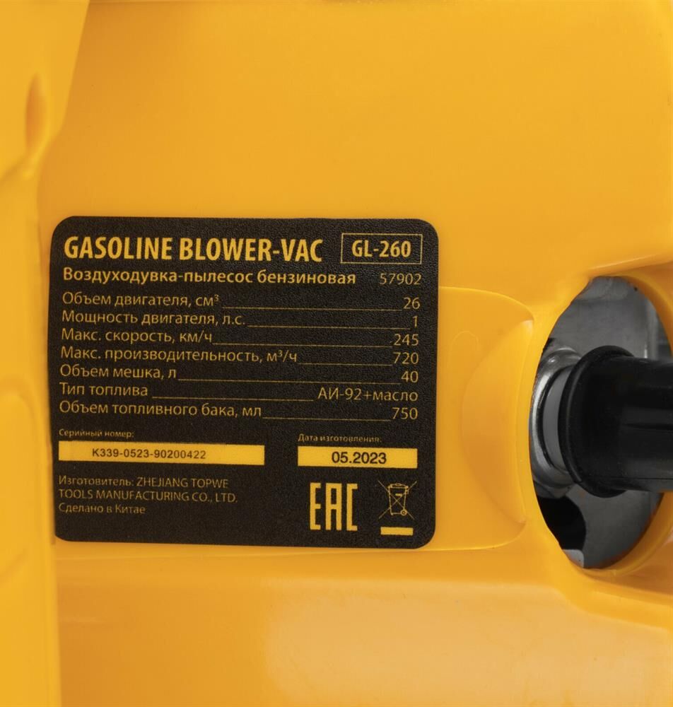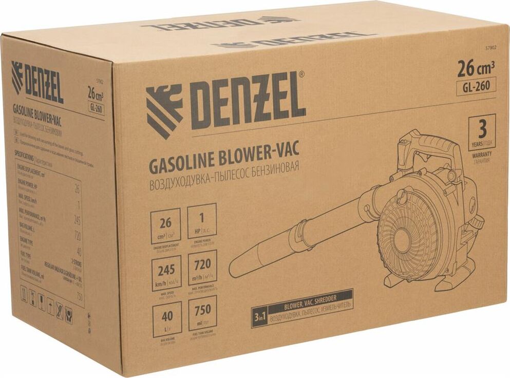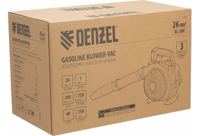 Бензиновая воздуходувкапылесос Denzel GL260 57902 с двухтактным двигателем объемом 26 см3 и мощностью 1 л.с. предназначена для очищения территории от листьев и скошенной травы. Скорость потока воздуха составляет 245 км/ч, что обеспечивает высокую эффективность работы.;Инструмент работает как в режиме обдува, так и всасывания: при этом мусор измельчается в мешок объемом 40 л, входящий в комплект поставки. Такое решение избавляет от необходимости вручную собирать листву и траву после уборки. Предусмотрена функция измельчения мусора, что позволяет использовать его в качестве мульчи для удобрения растений.