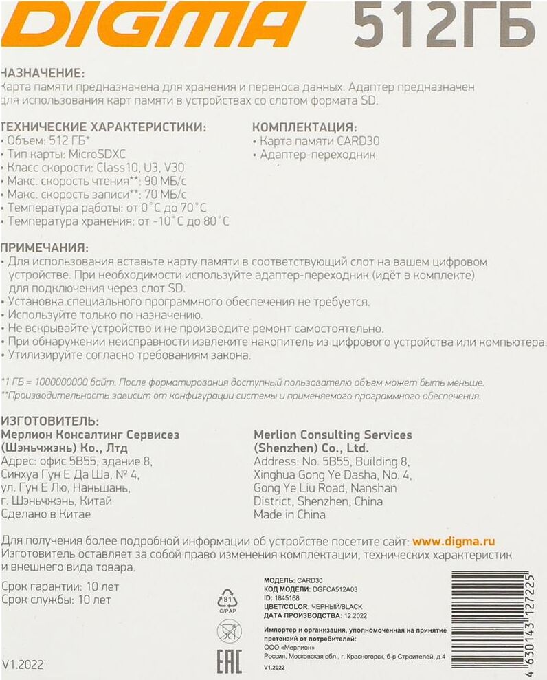 DIGMA Флеш карта microSDXC 512GB CARD30 V30 + adapter