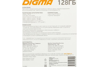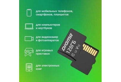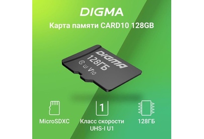 Основные характеристики Бренд DIGMA Модель CARD10 Подтип microSDXC Емкость 128 ГБ Классификация по скорости записи Class 10 Класс скорости UHS-I U1 Скорость чтения, макс. 90 МБ/с Скорость записи, макс. 35 МБ/с Переходник SD
