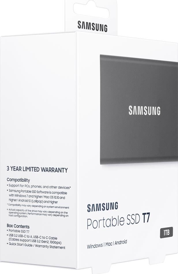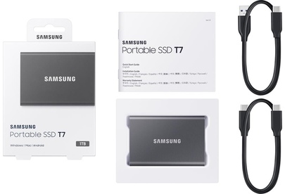 Цвет: Titanium Grey | Форм-фактор: 1,8" | Объем накопителя SSD: 1Тб | Серия: T7 | Аксессуары в комплекте: документация, кабель USB Type-C - USB Type-A, кабель USB Type C - USB Type C | Тип флэш-памяти: 3D NAND TLC | Скорость записи: 1000.00 | Скорость чтения: 1050.00 | Толщина диска: 8mm | USB-C: Yes |