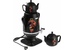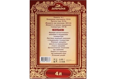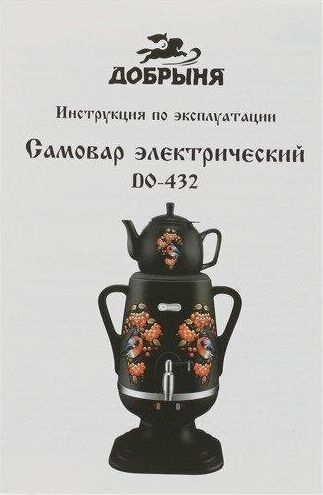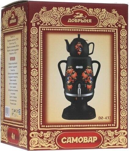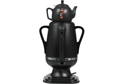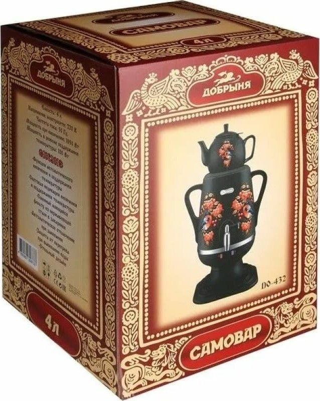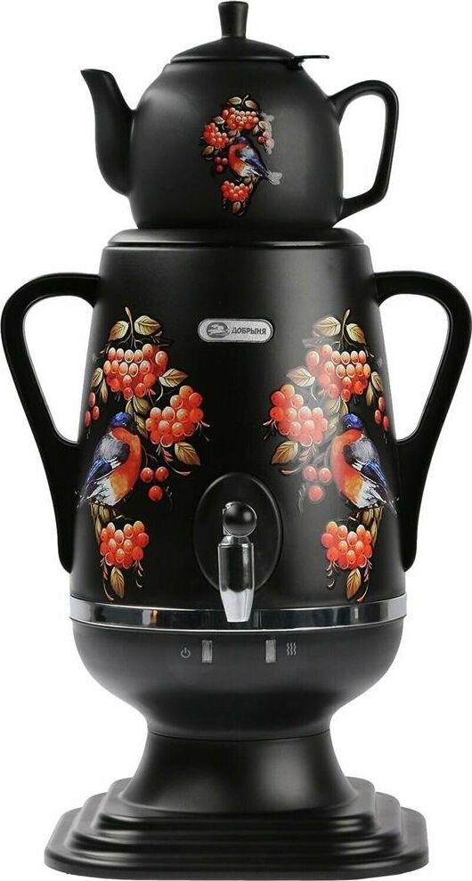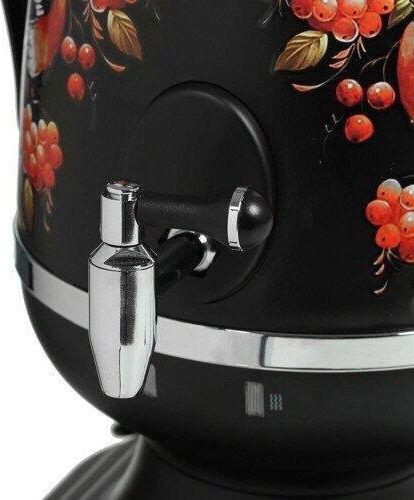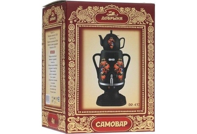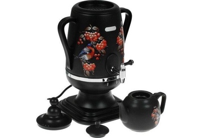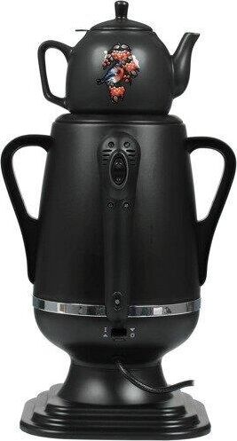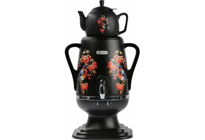 Электросамовар * Объём: 4 л * Материал: пластик * Цвет: черный с росписью * Керамический заварочный чайник 1 л со съёмным фильтром из нержавеющей стали в комплекте/высота 145мм * Хромированный кран * Функция термопота * Мощность при закипании 1850 Вт * Мощность в режиме подогрева 100 Вт * Дисковый нагреватель * световая индикация работы * автоматическое отключение * защита от перегрева при выкипании воды *