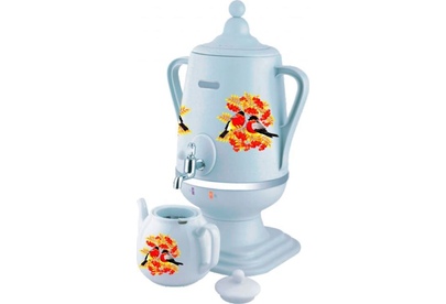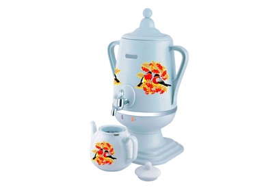 Самовар Объём: 4 л. Материал: пластик. Керамический заварочный чайник 1 л со съёмным фильтром из нержавеющей стали в комплекте/высота 145мм. Хромированный кран. Функция термопота. Мощность при закипании 1850 Вт. Мощность в режиме подогрева 100 Вт. Напряжение сети 220 В. Дисковый нагреватель, световая индикация работы, автоматическое отключение, защита от перегрева при выкипании воды.