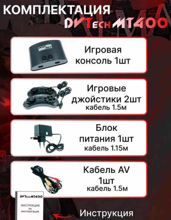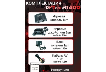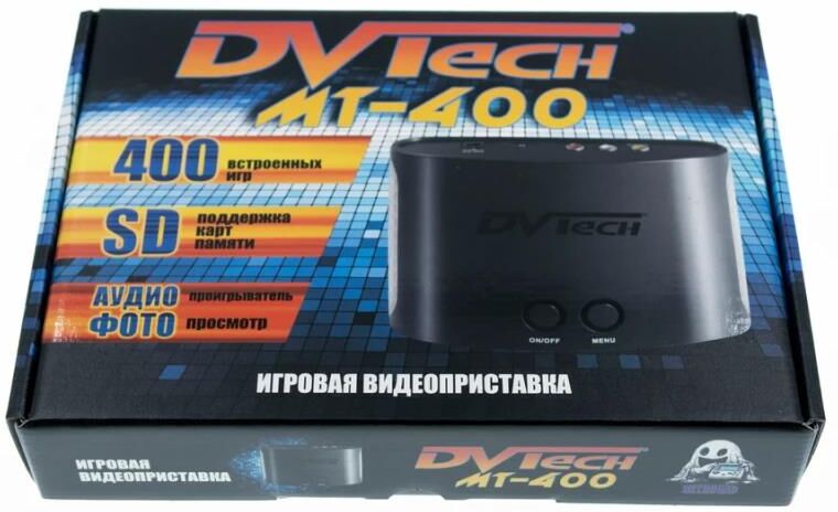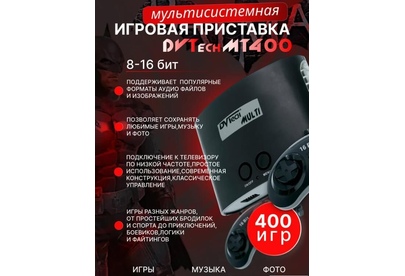 Погрузитесь в яркий и красочный мир классических 8- и 16-битных игр вместе с игровой мультиплатформенной приставкой DVTech MT 400 игр. Вы можете не только играть в игры, но и слушать музыку и просматривать фото. Ретро приставка DVTech поддерживает популярные форматы аудио файлов и изображений. • Совместимость с картами памяти формата microSD и microSDHC до 32 GB, записывайте любимые игры, музыку и фото, создавайте собственную коллекцию. • 400 предустановленных игр разных жанров, от простейших бродилок и спорта до приключений, боевиков, логики и файтингов; • Подключение к телевизору по низкой частоте, простое использование, современная конструкция, классическое управление; • Поддержка форматов: - Игры: 8 бит (.nes), 16 бит (.bin); - Аудио: mp3, aac, ape, flac, wav, amr; - Изображения: bmp, jpg, png, gif.