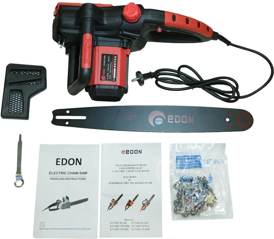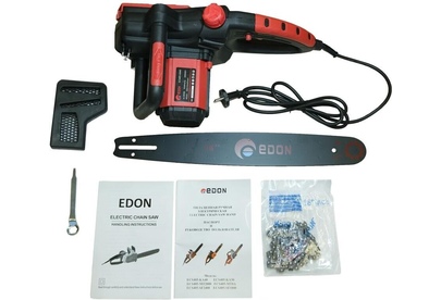 Пила цепная электрическая Edon ECS405-KA40 предназначена для распиловки деревьев, заготовки дров и выполнения других деревообрабатывающих работ в бытовых условиях. Мощность - 1800 Вт.; Напряжение - 220 В.; Число оборотов - 820 об/мин.; Скорость движения цепи - 13 м/с.; Длина шины - 16 дюймов; Длина шины - 40,5 см.; Шаг цепи - 3/8 дюйма; Количество звеньев - 59 шт.; Толщина звена - 1,3 мм.; Длина сетевого кабеля - 1,8 м