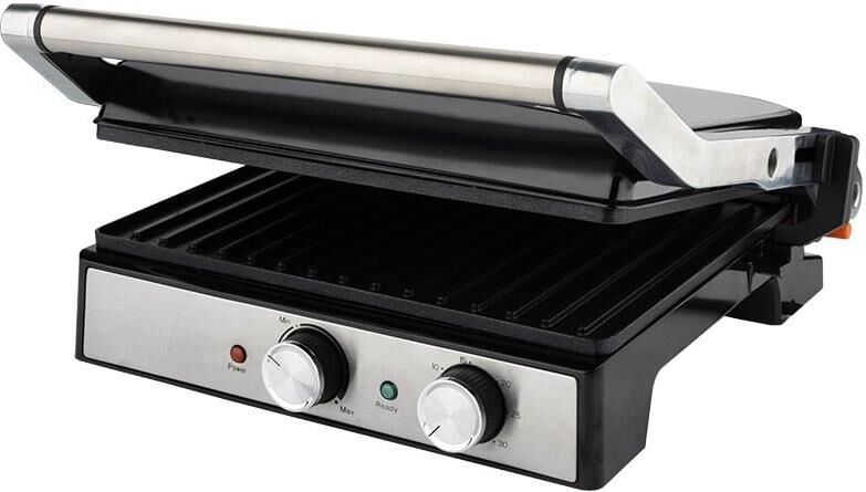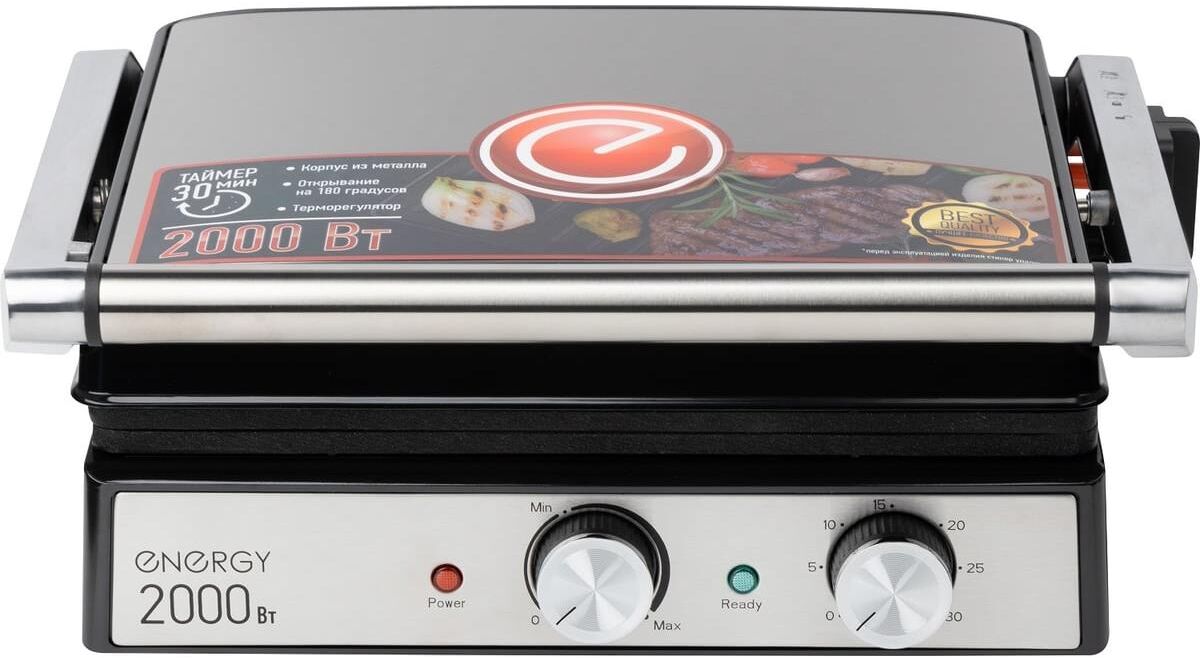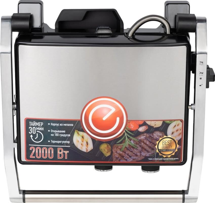 Гриль Световой индикатор работы и нагрева Терморегулятор Таймер на 30 минут Ненагревающаяся ручка Прорезиненные ножки Корпус их термостойкого пластика и металла Открывание на 180 градусов Мощность 2000Вт Размер: 29*23см Длина шнура 75 см