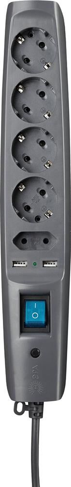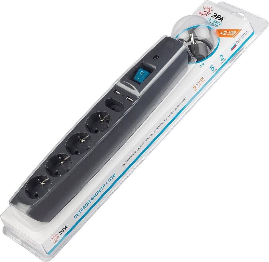 Сетевой фильтр пятиместный 2 м SFU-5es-2m-B "Эра" (10 А, надежный уровень защиты, 2 USB) с заземлением и защитными шторками, с выключателем, черный Мощный сетевой фильтр "Эра" серии SFU (надежный уровень защиты): защита аудио-, видеотехники, компьютеров, телефонов и другой техники от скачков напряжения, высокочастотных и импульсных помех (источники помех: дрель, пылесос, сварочный аппарат и др, подключение и отключение мощных энергопотребителей на подстанции)