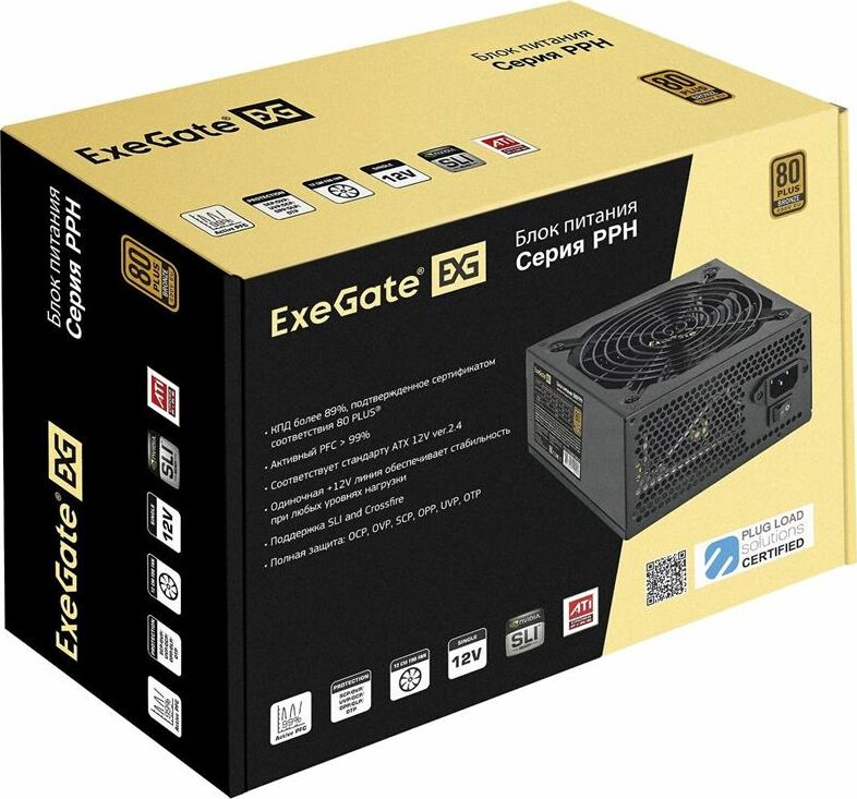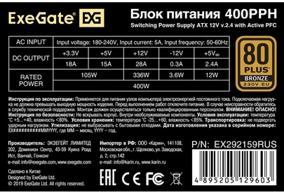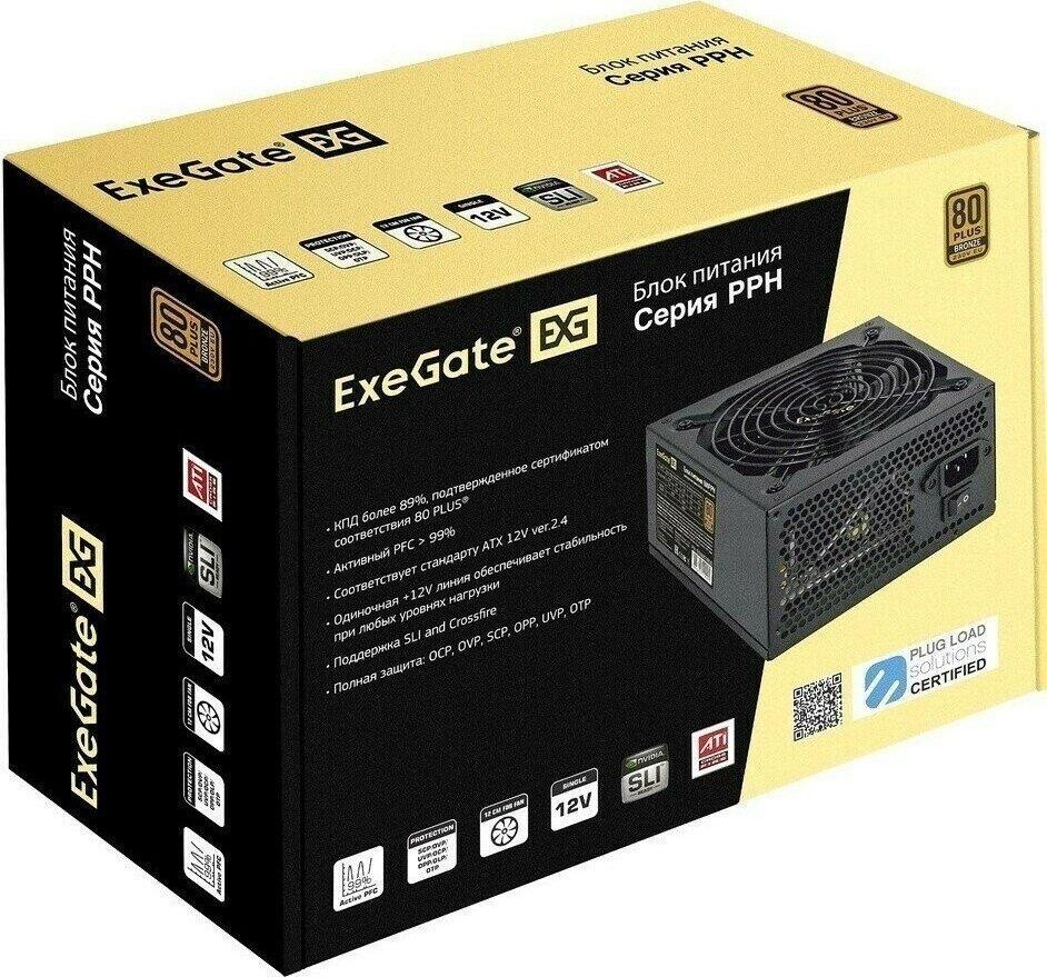 EXEGATE Блок питания 400W 400PPH black (ATX, 80+Bronze, APFC, 20+4P, 2xPCIe 6+2P, 3хMolex, 3xSATA, 1