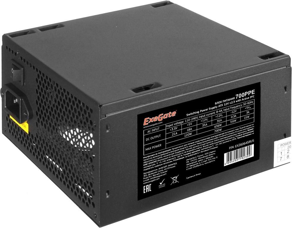 EXEGATE EX260645RUS-PC Блок питания 700W 700PPE (ATX, APFC, PC, КПД 80% (80 PLUS), 12cm fan, 24pin,
