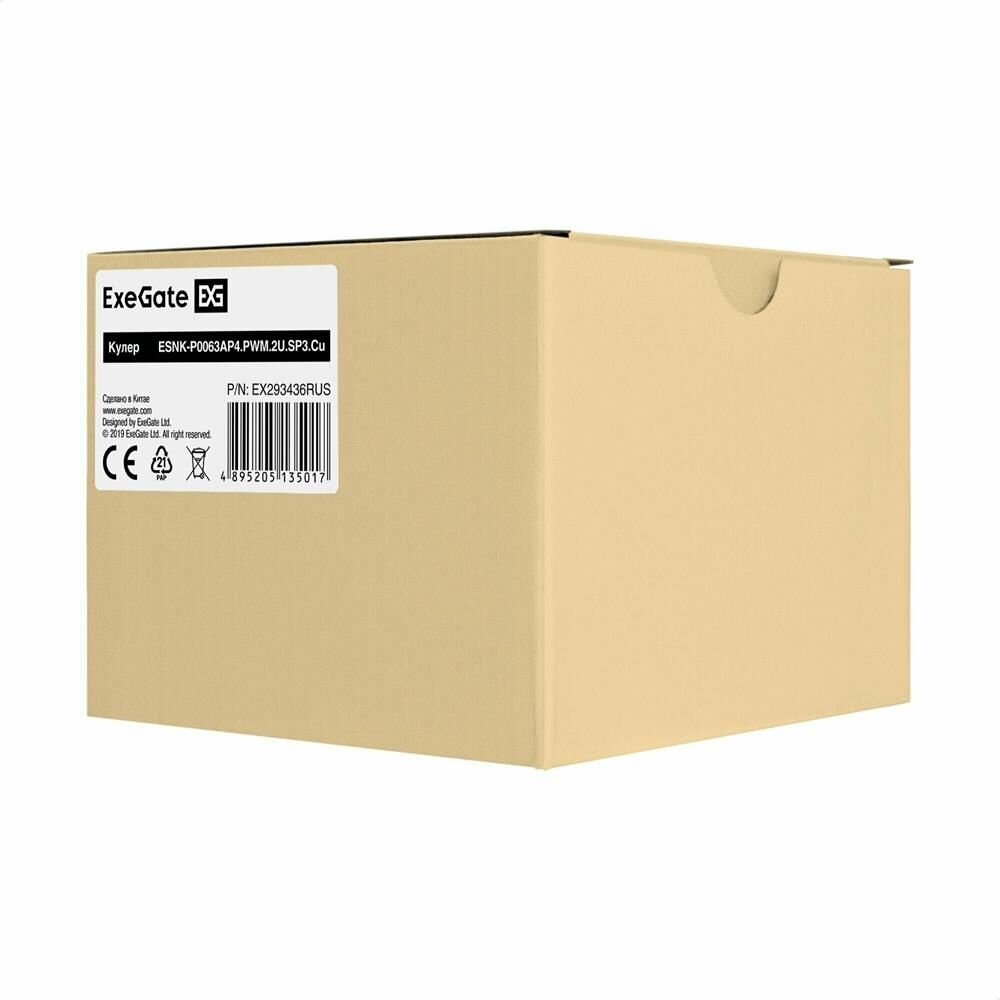 [Вентиляторы] Exegate EX293436RUS ESNK-P0063AP4.PWM.2U.SP3.Cu (Al+Cu, 2U, 4 тепл. трубки, LGA SP3, TDP 240W, PWM, 1600-6800RPM, 2 ball bearing, 4pin, 54,3db, 440г, на винтах, с термопастой, Retail box)