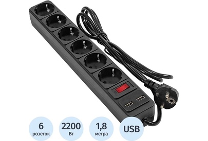 Сетевой фильтр-удлинитель с USB зарядкой ExeGate SP-6-USB-1.8B (6 евророзеток с заземлением, 2 USB-A 2A, 1.8м, защита от перегрузки, выключатель с подсветкой, черный)