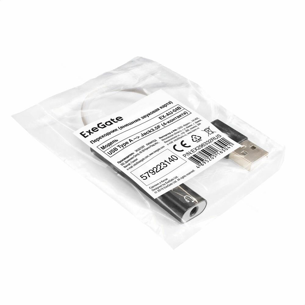[Переходник] Exegate EX296332RUS Кабель-адаптер для подключения телефонной гарнитуры к порту USB ExeGate (внешняя звуковая карта USB, 1x Jack3.5 F (4-контакта), кнопки: volume +, volume -, play/pause/n