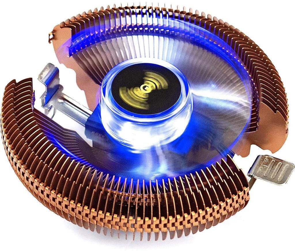 Количество вентиляторов: 1. Размер вентилятора: 90. Материал радиатора: алюминий+медь. Тип поставки: Ret. Цвет подсветки: голубой. Высота кулера: 45. Вес: 198. Ширина кулера: 110. Длина кулера: 110. Макс, рассеиваемая мощность (TDP, Вт): 80. Направление выдува: перпендикулярно МП. Срок службы вентилятора: 35000. Питание вентилятора от материнской платы: 3-pin. Потребляемое напряжение вентилятора: 12. Потребляемая сила тока вентилятора: 0.22. Термопаста в комплекте: есть. Габариты упаковки (ед) ДхШхВ: 0.13x0.118x0.07. Вес упаковки (ед): 0.25. Тип подсветки: одноцветная. ЖК дисплей: нет. Тип конструкции: горизонтальный. Гарантия: 12 мес.. Скорость вращения вентилятора: 2200 об/мин. Тепловые трубки: без тепловых трубок. Воздушный поток вентилятора: 48 cfm. Уровень шума вентилятора: 22 дБ. Цвет товара: медный. Тип крепления: на защелках. Socket: 754, 939, 940, AM2, AM2+, AM3, AM3+, AM4, AM5, FM1, FM2, FM2+, LGA 1150, LGA 1151, LGA 1155, LGA 1156, LGA 1200, LGA 1700, LGA 1851, LGA 775. Особенности системы охлажден