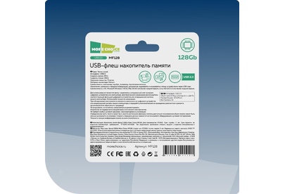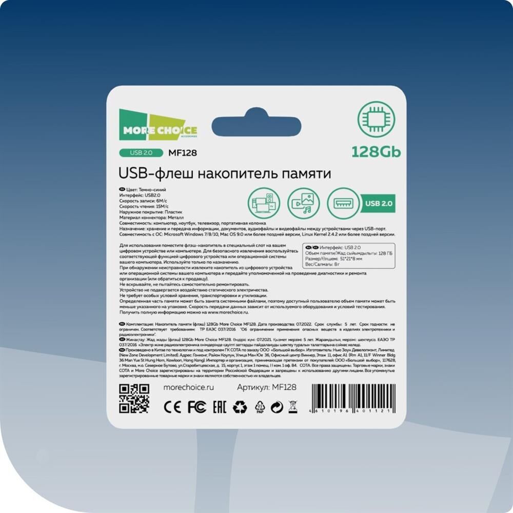 Производитель MORE CHOICE; Объем памяти 128 Гб; Скорость передачи данных 15 Мб/с; Выдвижной разъем Нет; Форм-фактор Стандарт; Водонепроницаемый корпус Нет