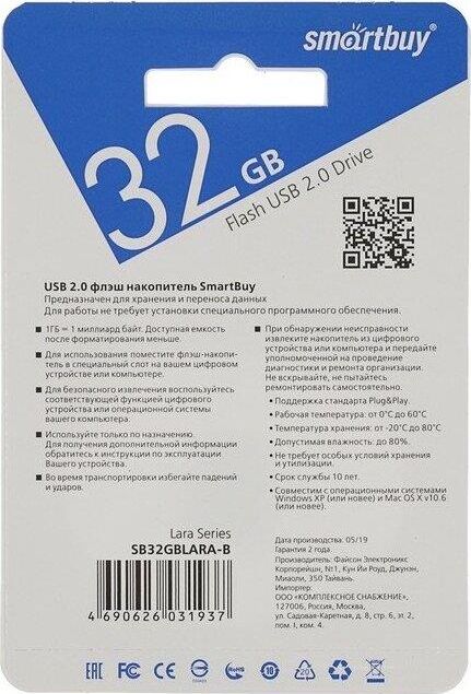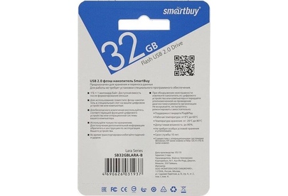 Компактный флэш-накопитель LARA , объем 32 ГБ, интерфейс подключения USB 2.0, скорость чтения данных 15 МБ/с, скорость записи данных 5 МБ/с, материал корпуса - пластик.