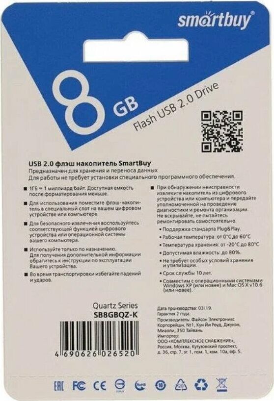 Флэш-накопитель QUARTZ, емкость 8GB, интерфейс USB 2.0, материал корпуса пластик, поддержкаWindows 10/8/7/XP/2000/Vista, Mac OS 8.6 и Linux 2.4.0 (или выше),классическая конструкция с колпачком, отверстие для шнурка.
