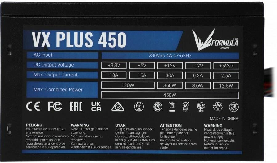 FORMULA Блок питания (AEROCOOL) 450W VX PLUS 450 Black (ATX, 20+4 pin, PCIe 6+2P, 2хMolex, 2xSATA, 1