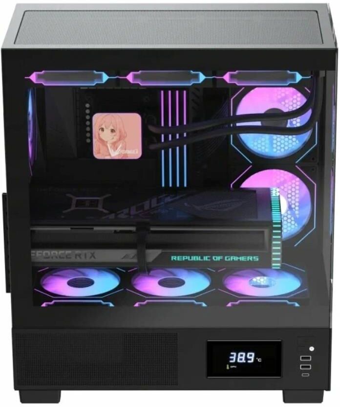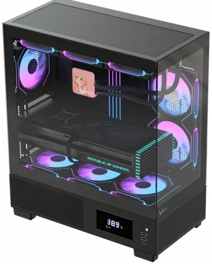 Отсеки 3,5" внутренние: 2. Фронтальные аудио-разъемы: есть. Материал корпуса: сталь/пластик/стекло. Боковая панель: прозрачная. Типоразмер: Midi-Tower. Внутренняя корзина для HDD: съемная. Расположение БП: нижнее. Максимальная длина видеокарты: 400. Отсеки 2,5" внутренние: 3. Фронтальные разъемы USB 3.0: 2. Количество слотов расширения: 7. Наличие блока питания: отсутствует. Фронтальная панель: прозрачная. Для геймеров: да. Особенности внутренних отсеков: 3,5" и 2,5" - взаимозаменяемые. Максимальная высота кулера процессора: 160. Фронтальные разъемы USB 3.1 Type-C: 1. Материал прозрачной боковой панели: закаленное стекло. Материал прозрачной передней панели: закаленное стекло. Габариты упаковки (ед) ДхШхВ: 0.54x0.265x0.475. Вес упаковки (ед): 4.2. Дисплей: есть. Возможность установки СВО 360 мм: ДА. Общее кол-во установленных вентиляторов: 0. Подсветка корпуса: есть. Тип подсветки: ARGB. Фиксация боковых панелей: винты. Форм-фактор БП: ATX. Гарантия: 12 мес.. Вентиляторы на задней панели: 1х120 мм. Вентилятор