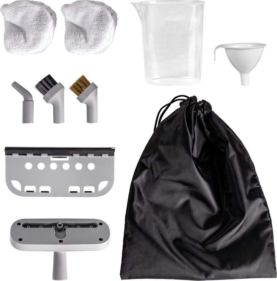 подробная комплектация: 5 насадок (насадка для чистки стекол, насадка для отпаривания, нейлоновая щетка, медная щетка, щелевая насадка), тряпка - 2 шт, коннектор для подсоединения насадок, воронка для наполнения бойлера водой, мешок для хранения аксе