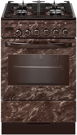 Комбинированная, газоэлектрическая плита шириной 50 см. Коричневого цвета, на фасаде рисунок, имитирующий мрамор.