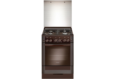 Коричневого цвета газовая плита шириной 60 см, панель управления и дверца выдвижного ящика декорированы стеклянными накладками. Рядом с ручкой регулировки температуры духовки установлен таймер со звуковым сигналом, все горелки рабочего стола и духовки оснащены электроподжигом (осуществляется нажатием кнопки на панели) и газ-контролем.