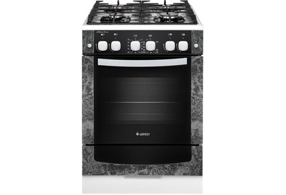 Газовая плита шириной 60 см, современный дизайн с выступающими элементами в белом цвете. Основная цветовая гамма - рисунок, имитирующий мрамор, сам фасад-стеклянный. Модель смотрится оригинально, техническим оснащением обладает достаточным для ежедневного использования.