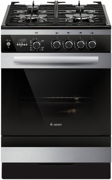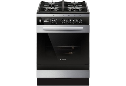 Газовая плита шириной 60 см, в черном цвете, стеклянный фасад декорирован накладками из нержавеющей стали. Современный дизайн, отлично вписывается в обстановку кухни. Комфорт использования и безопасность - все газовые горелки с автоматическим электроподжигом и газ-контролем. Электронный таймер функционирует как часы, будильник с подачей звукового сигнала об окончании заданного времени, можно выставить отключение горелки рабочего стола и духовки.