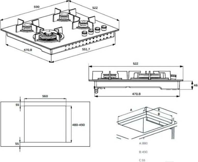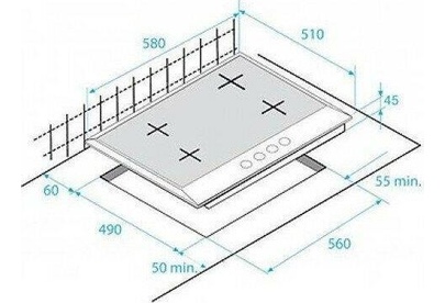 (ШхГ) 58х51см. Цвет нерж. сталь.Варочная панель газовая независимая. Тип управления механическое. Переключатели поворотные. Электроподжиг механический. Газовых конфорок 4. Панель конфорок металл.