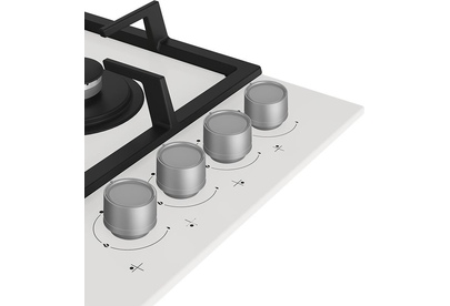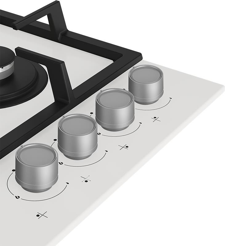(ВхШхГ) 46х524х590мм.Цвет белый.Газовая поверхность: 4 газовые конфорки (в т.ч. Wok). Газ-на-стекле. Панель управления спереди. Газ-контроль. Высокоэффективные конфорки. Встроенный электроподжиг. Чугунная решетка.Тип газа магистральный Давление G 20-20.Подставка-переходник для турки хромированная.