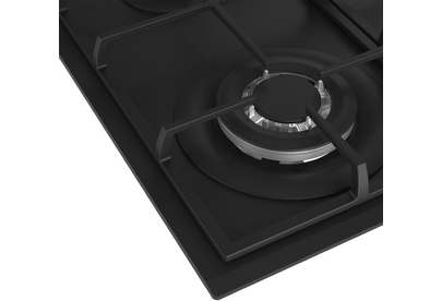 Газ на стекле; 4 конфорки; 60см; одна зона с двойным уровнем пламени; автоподжиг; газ-контроль; чугунные решетки; Расположение панели управления фронтальное; Цвет: Черный