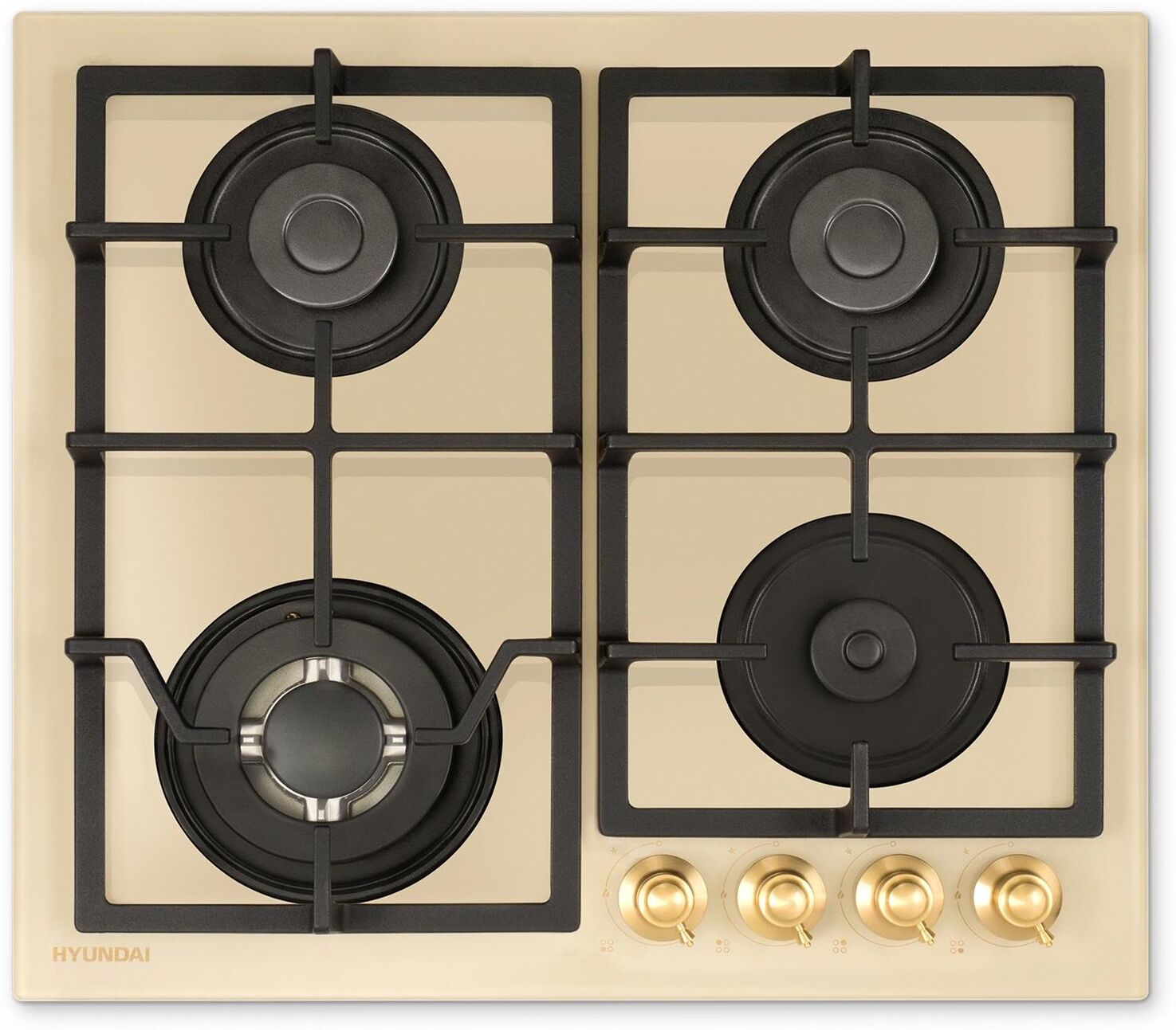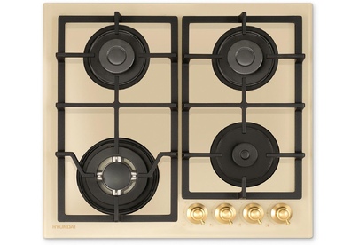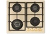 Газовая варочная поверхность, ширина 60 см, 4 газовые конфорки, поворотные переключатели, электроподжиг, чугунные решетки, цвет – бежевый