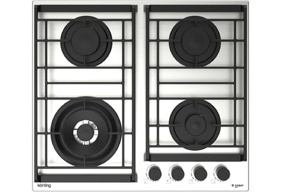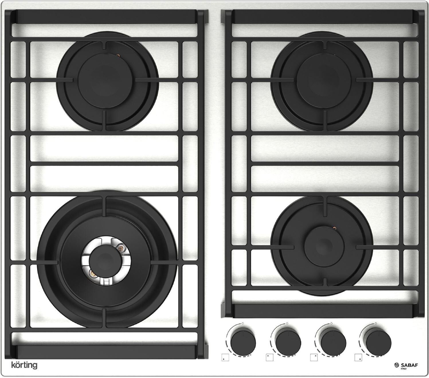Газовая варочная панель, ширина 60 см, 4 высокоэффективные полностью черные конфорки SABAF (Италия), Общая мощность – 8,5 кВт, Сверхмощная конфорка WOK, 4 кВт, Поворотные регуляторы черного цвета, Газ-контроль, Электроподжиг, Чугунные держатели для посуды Цвет: нержавеющая сталь