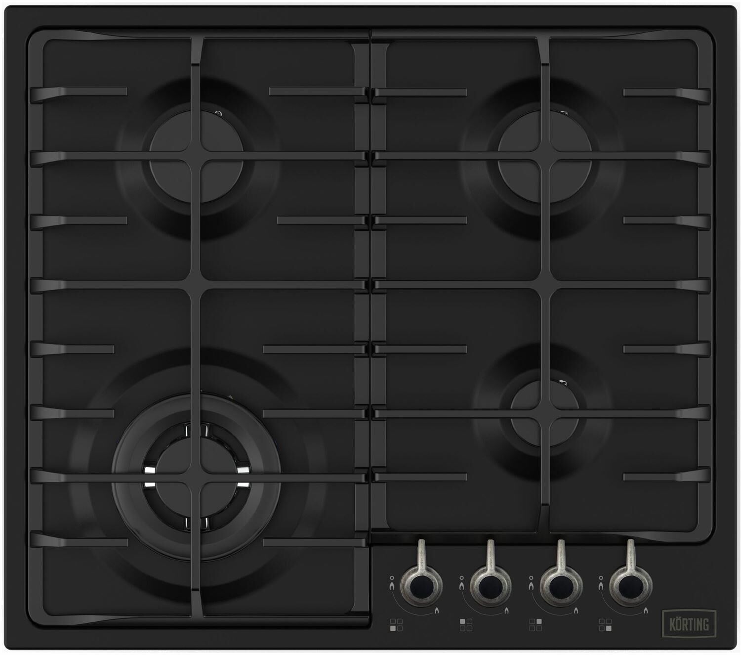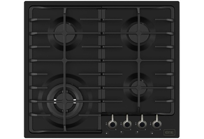 Газовая варочная панель 60см в ретро-дизайне, 4 высокоэффективные конфорки, WOK- сверхмощная конфорка, автоматический электроподжиг, газ-контроль каждой конфорки, передние переключатели, чугунные решетки, металлический логотип,чугунный адаптер для WOK-конфорки и адаптер для кофейника, цвет- матовый черный, цвет ручек- состаренное серебро.