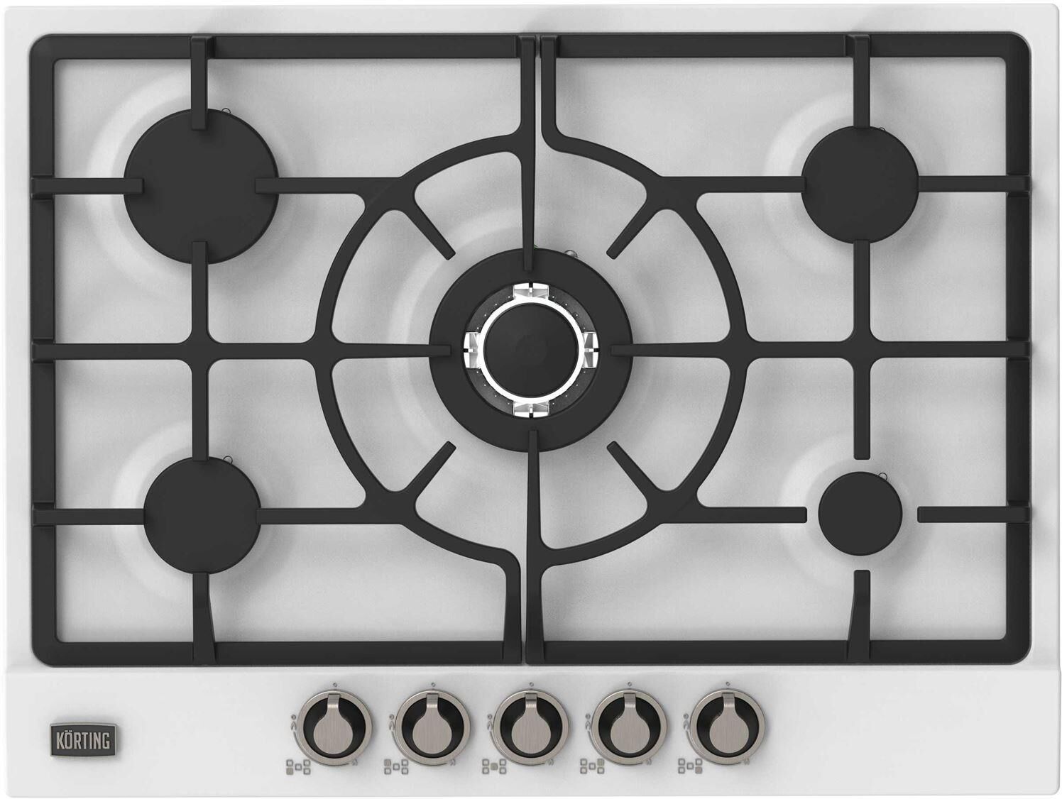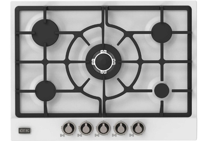 Газовая варочная панель 70 см в ретро-дизайне, 5 высокоэффективных конфорок, сверхмощная конфорка WOK 3,8 кВт, автоматический электроподжиг, газ-контроль каждой конфорки, чугунные решетки, металлический шильд с логотипом Korting, в комплекте - чугунная подставка WOK и адаптер для кофейника, цвет - белый, цвет регуляторов - хром