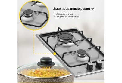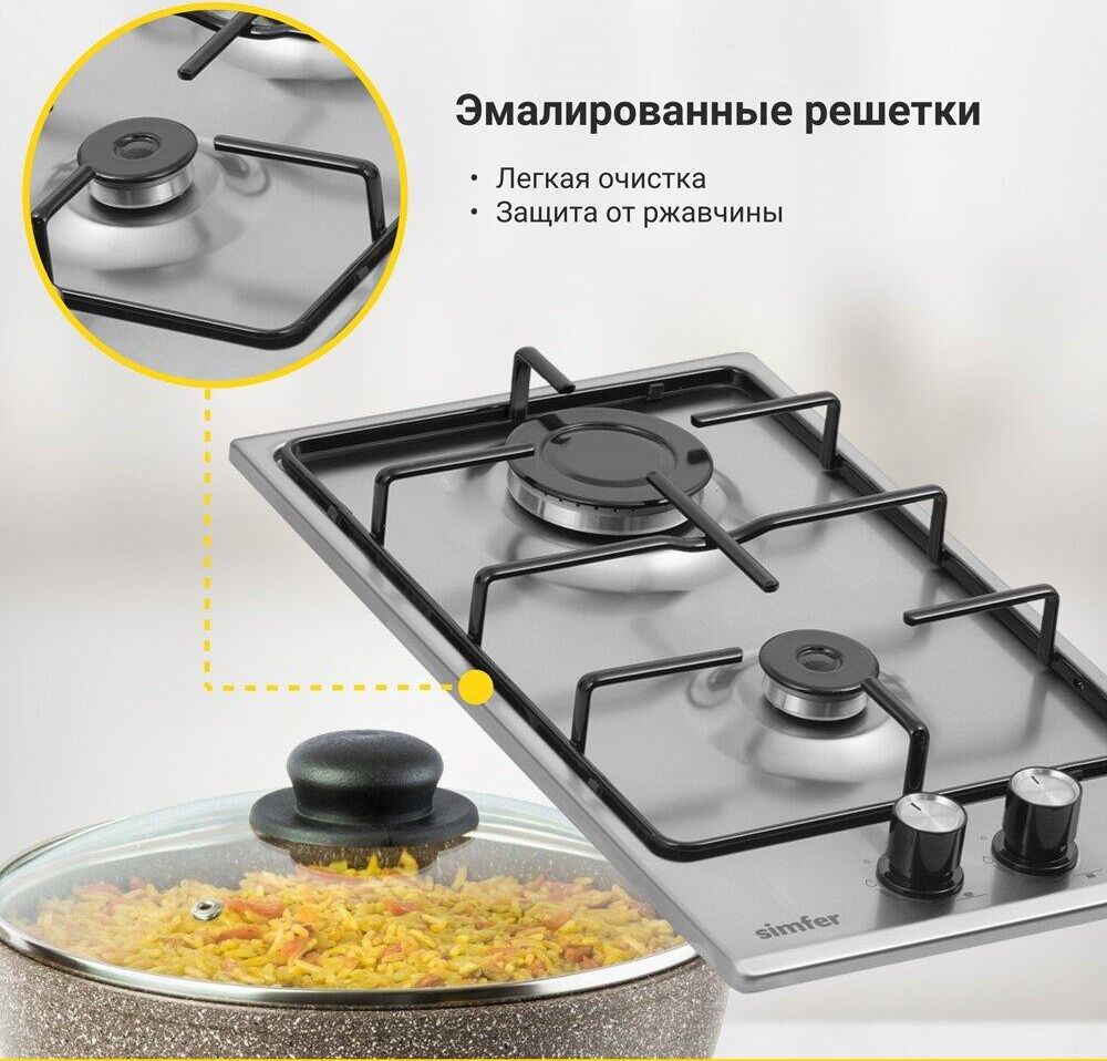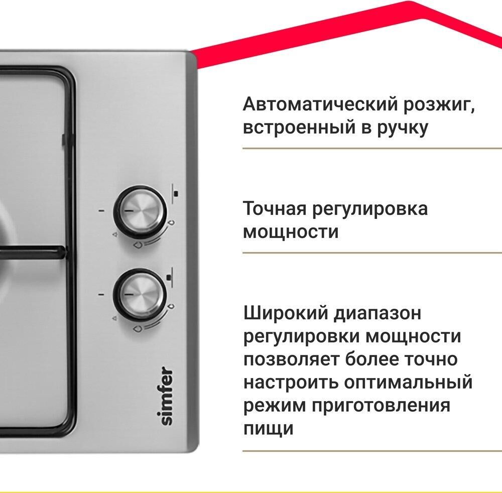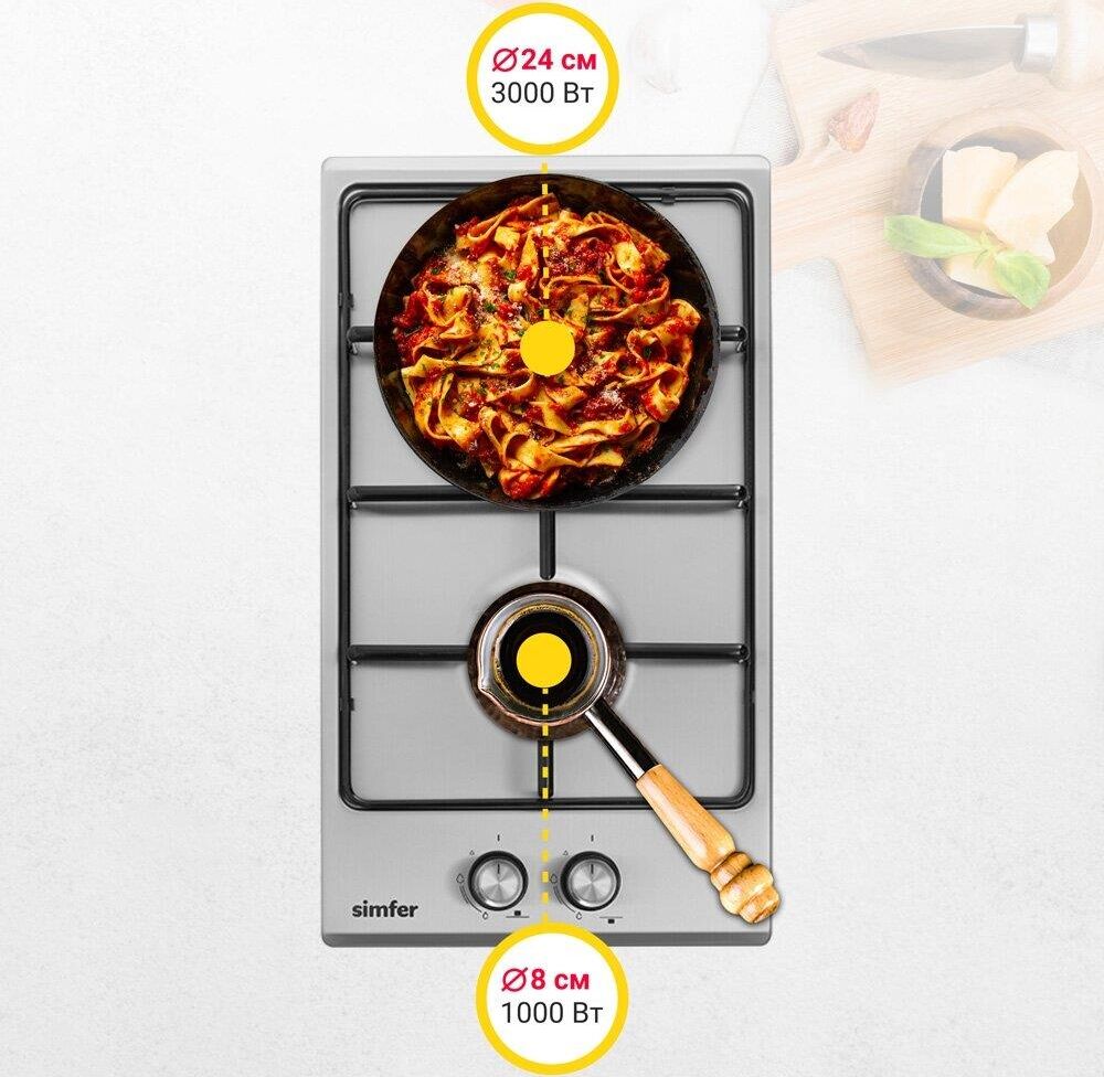 Газовая варочная панель Simfer H30V20M411 - модель, которая благодаря своим компактным размерам органично впишется в интерьер вашей кухни и сделает ежедневный процесс приготовления еды комфортным. Рабочая поверхность выполнена из нержавеющей стали – прочного и долговечного материала. На ней располагаются две конфорки - разные по диаметру и мощности пламени в них. А значит вы сможете выбрать оптимальную конфорку для приготовления разнообразных блюд.