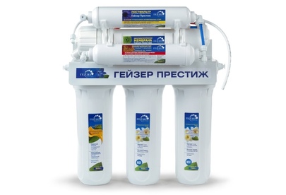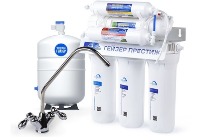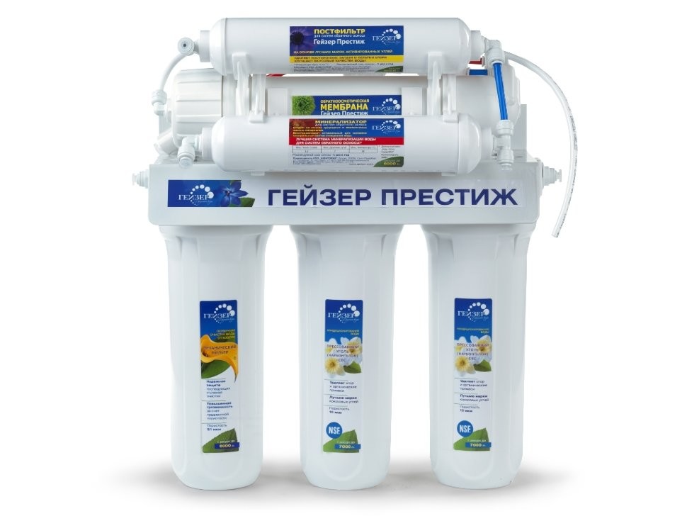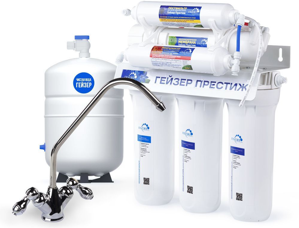 обратный осмос с минерализатором, кран 7 двойной Тип фильтра: Обратный осмос Кол-во ступ. очистки: 6 Ном.произв-сть (л/сут): 200 Накопит.бак (л): 12 Кран: №7 Насос: Нет Минерализатор: Да Состав картриджей фильтра Гейзер Престиж-М: 1-я ступень очистки (картридж PP 5 мкр.). Ресурс 20000 литров. 2-я ступень очистки (картридж СВС). Ресурс 7000 литров. 3-я ступень очистки (картридж СВС). Ресурс 7000 литров. 4-я ступень очистки (обратноосмотическая мембрана 50 галлон). Ресурс 1,5 - 2 года. 5-я ступень очистки (угольный постфильтр). Ресурс 1 год. 6-я ступень (минерализатор). Ресурс 1 год. Подходящий набор предфильтров Гейзер №6 Подходящий набор фильтров для полной замены Гейзер RO2