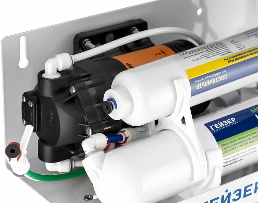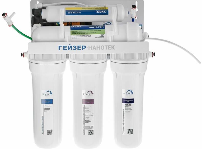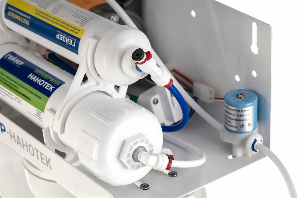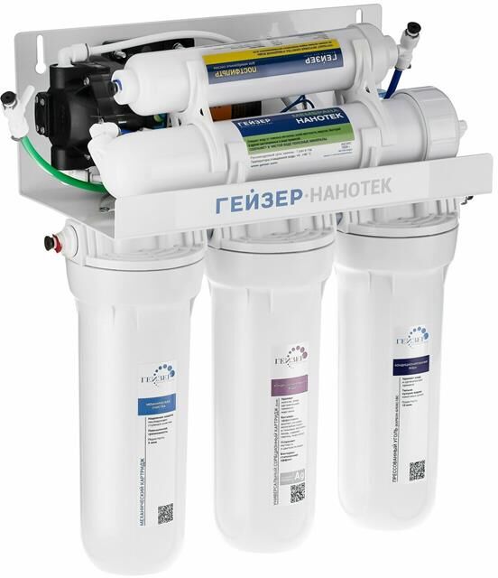 Фильтр Гейзер Нанотек П работает при давлении в подводящей магистрали не менее 2 атм. Устройство повышения давления, входящее в комплект, повысит уровень давления до 3-6 атм.