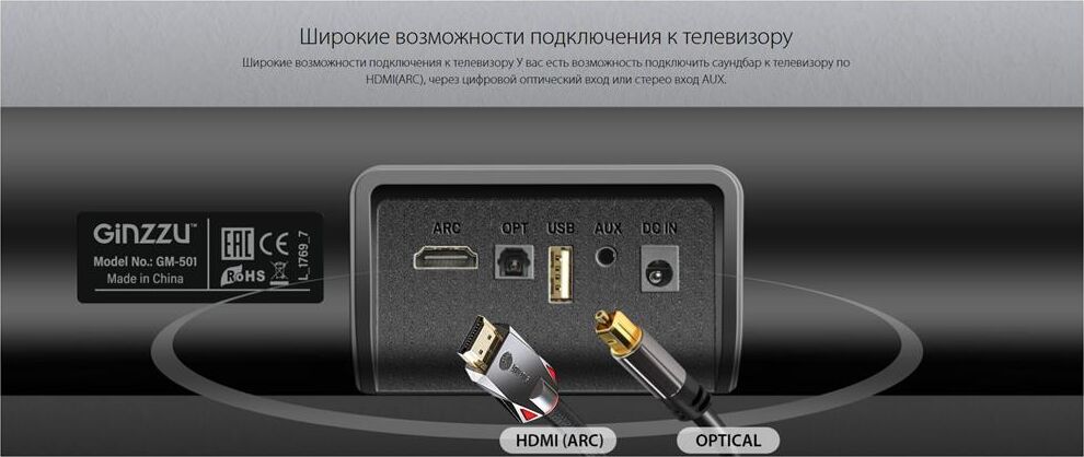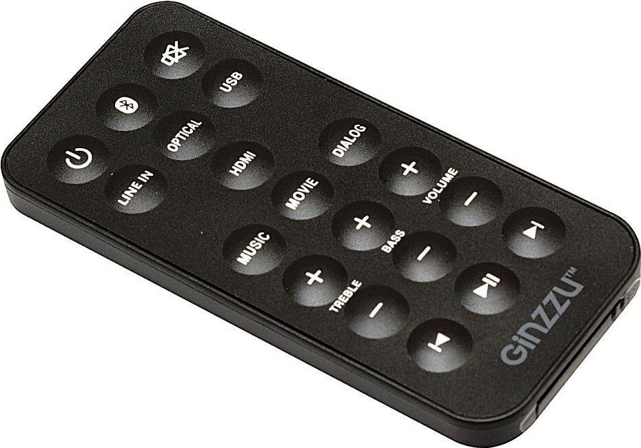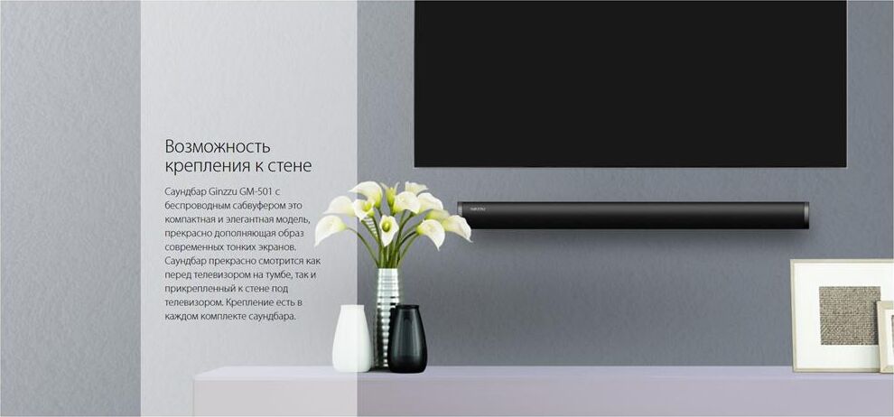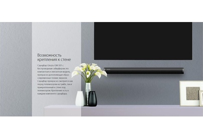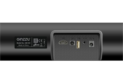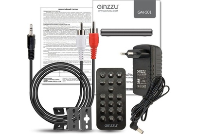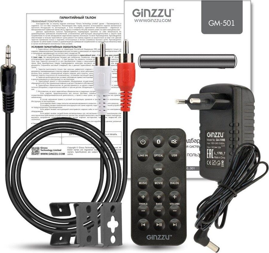 саундбар Ginzzu GM-501, адаптер питания GA-3109B, аудиокабель DC-jack3.5mm x 2RCA, пульт ДУ, комплект для крепежа на стену, документация
