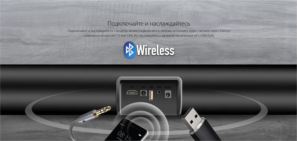 Саундбар - акустическая система 2.0 с Bluetooth. Выходная мощность (RMS) 20 Вт (2 x 10 Вт). Вход HDMI ARC. Вход OPTICAL. Вход AUX: стерео вход (2RCA). Вход LINE IN 3,5 мм. Bluetooth: V5.0. Встроенный аудио-плеер: TF-card, USB-flash. Диапазон воспроизводимых частот: 50 Гц - 15 КГц. Пульт дистанционного управления. Режимы MUTE, STANDBY. Эквалайзер: Music, Movie, Dialog. Регулировка громкости, высоких и низких частот. Комплект крепежа.