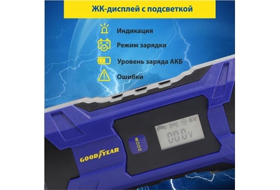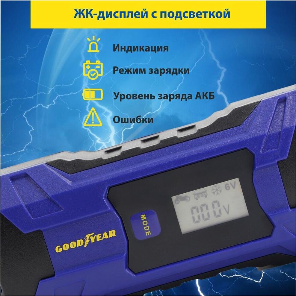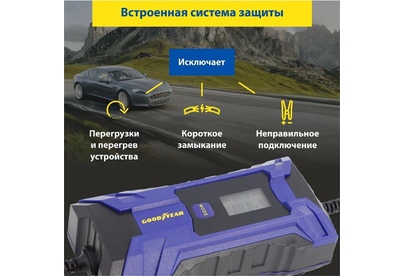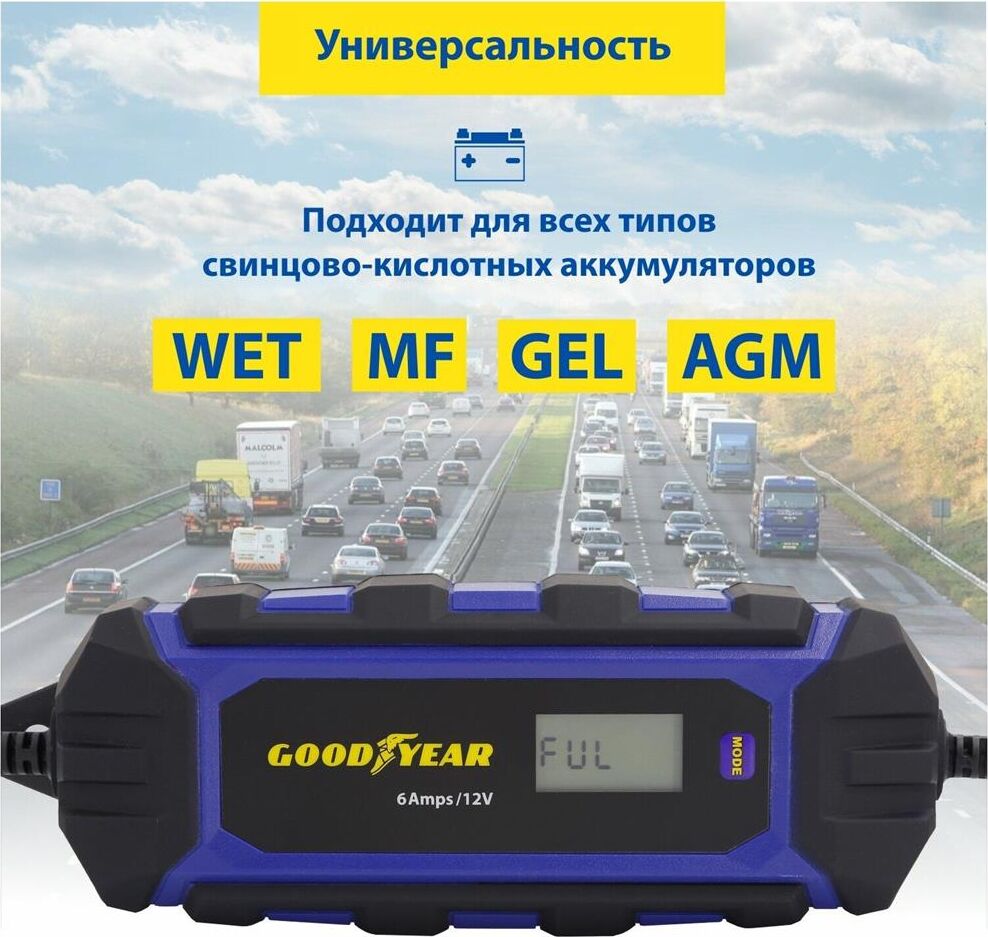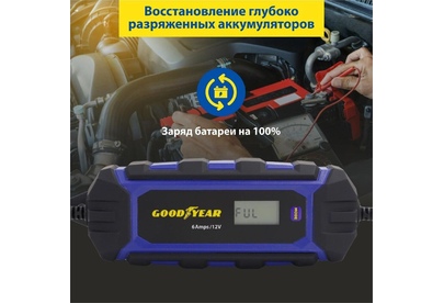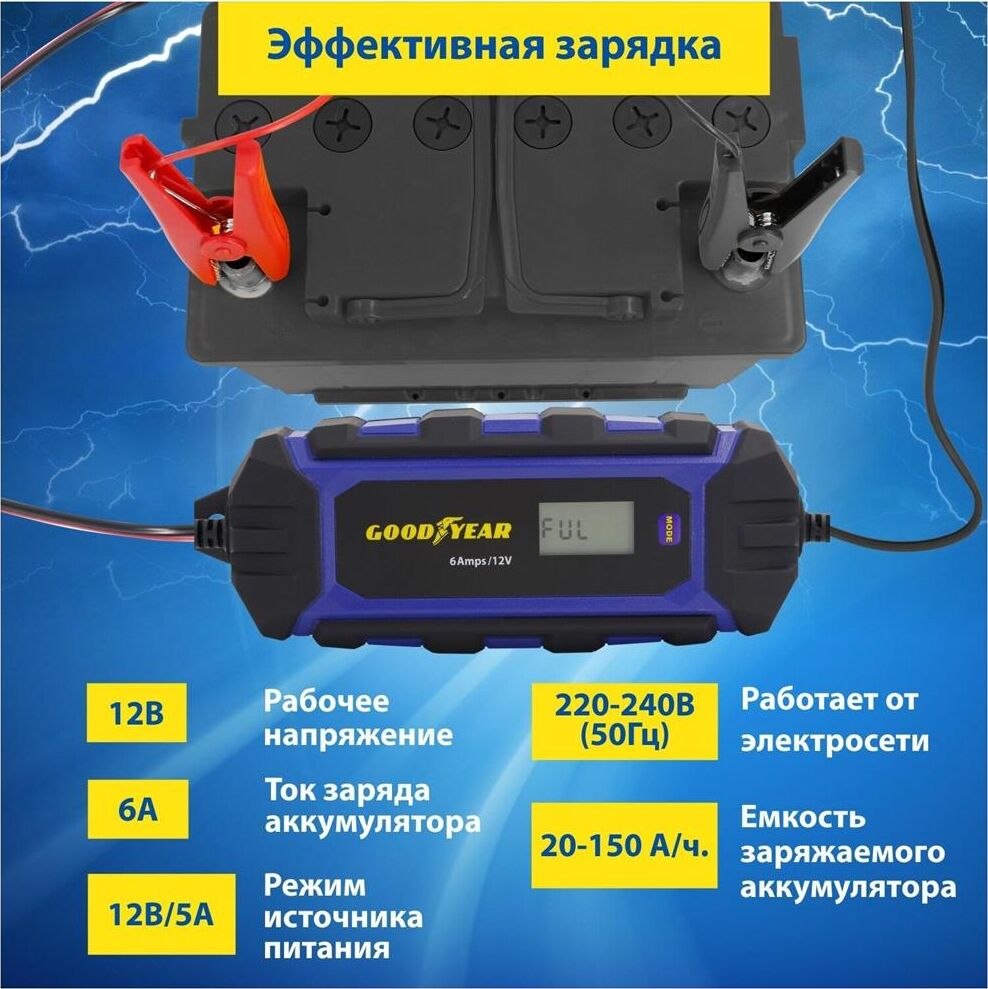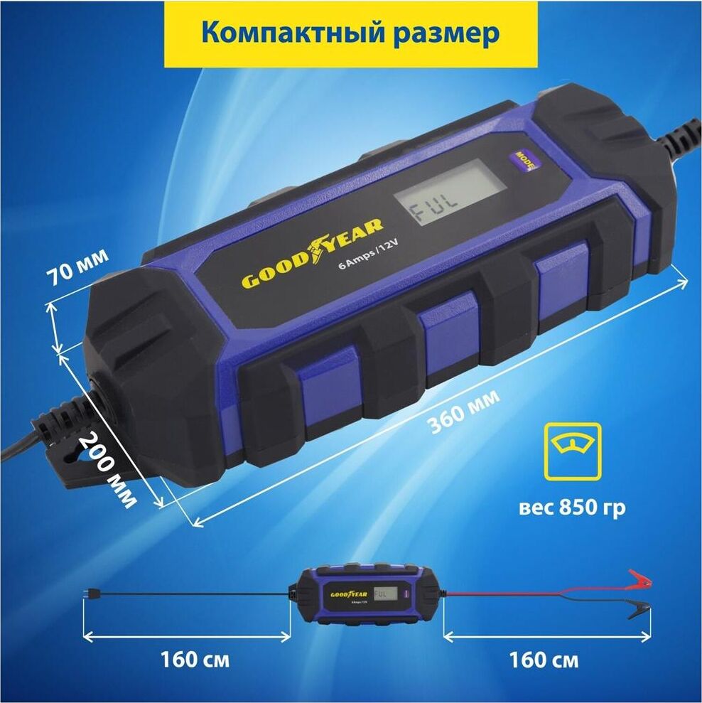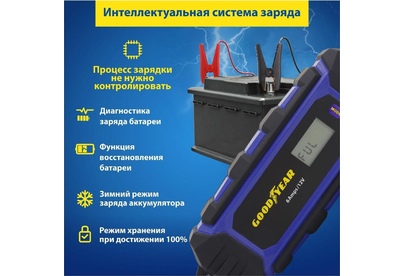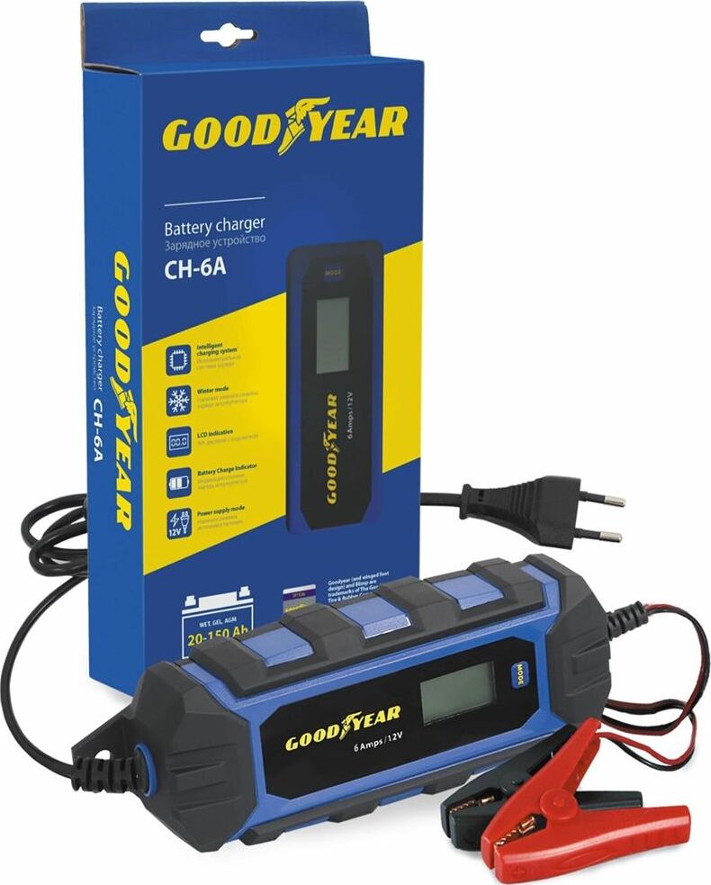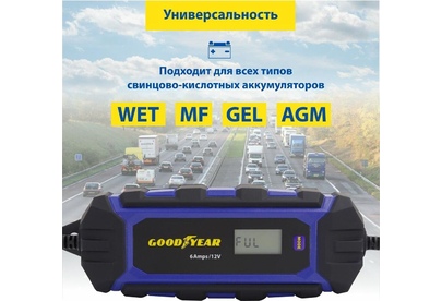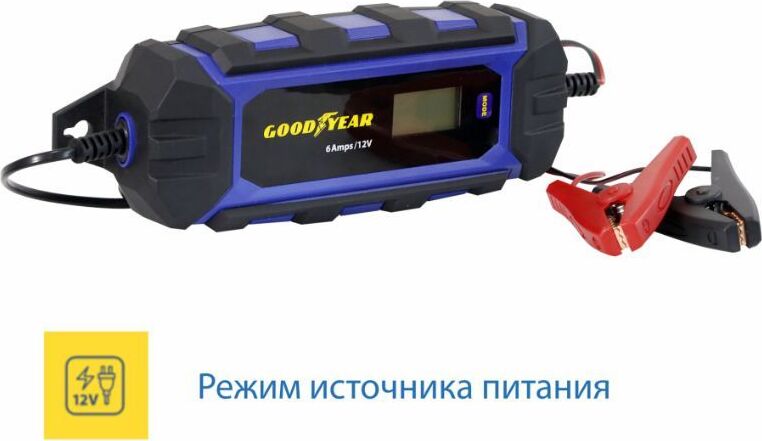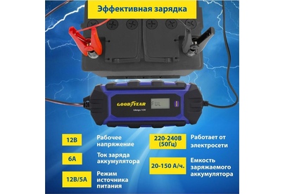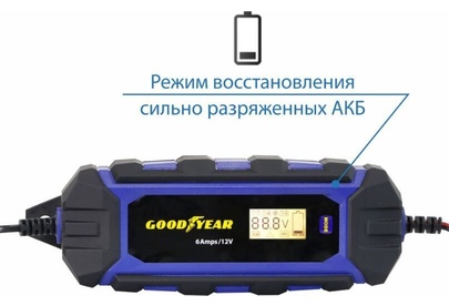 Электронное зарядное устройство Goodyear Smart для аккумулятора, модель CH-6A. Применяется для заряда всех типов свинцово-кислотных автомобильных аккумуляторов WET, MF, GEL, AGM. Напряжение электросети 220-240В (50Гц) Цвет корпуса Синий, черный