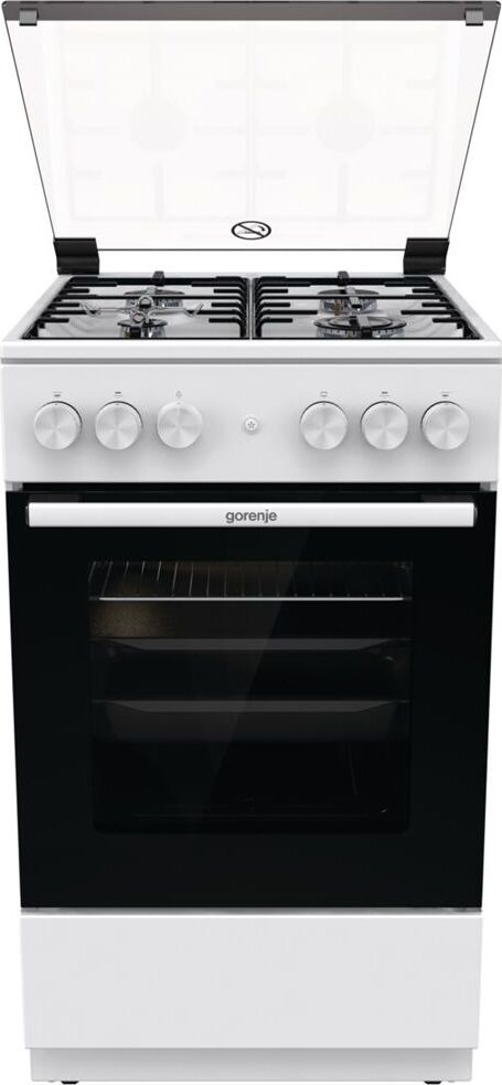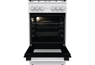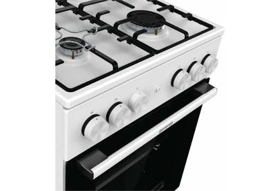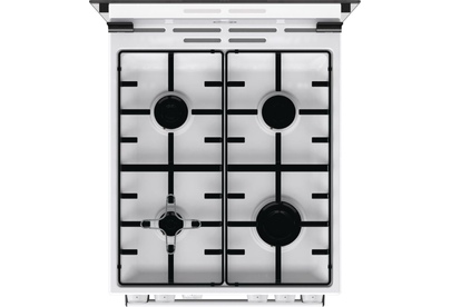 Газовая плита, Цвет: Белый, Материал дверцы: Стеклянная дверца, Стандартный шарнир дверцы, Крышка: Стеклянная крышка, Тип духовки: Газовая духовка, Газовая варочная панель, Электроподжиг кнопкой варочной поверхности и духовки, Количество конфорок: 4 конфо