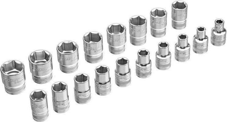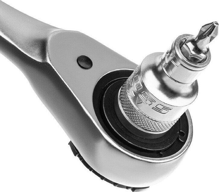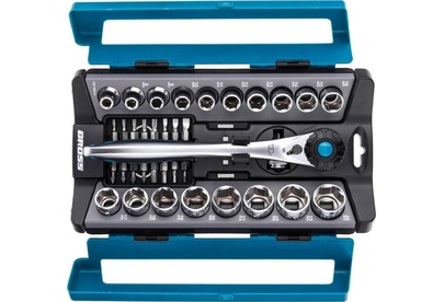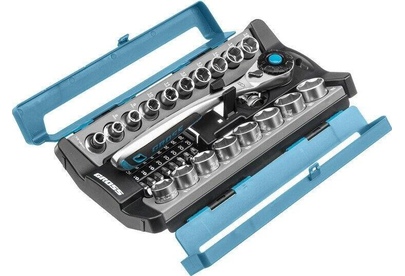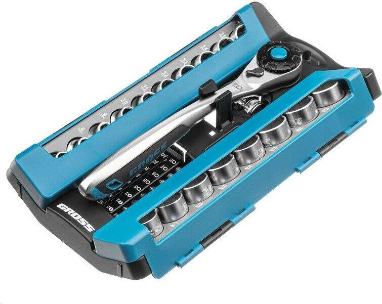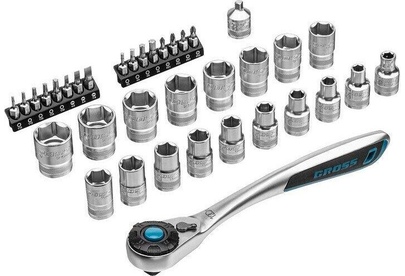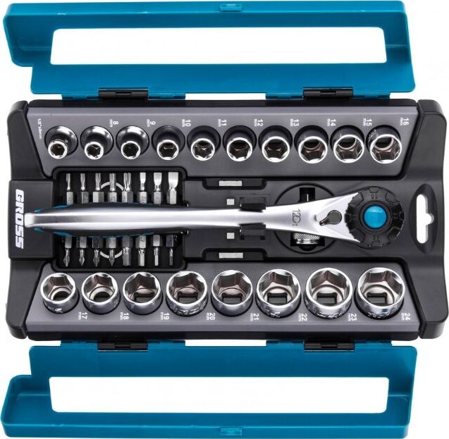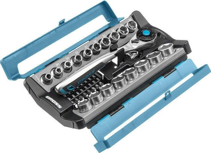 Наборы инструмента GROSS разработаны специально для автолюбителей и центров технического обслуживания. Головки и комбинированные ключи изготовлены из хромованадиевой стали, придающей инструменту исключительную твердость в сочетании с легкостью. Биты, биты-вставки и отвертки производятся из стали S2, улучшающей свойства инструмента. Набор комплектуется трещотками с реверсом и быстрым сбросом, трещоточный механизм имеет 120 зуба и обеспечивает исключительную мягкость и плавность в работе. Шаг зуба 3 град. Все наборы упакованы в кейс. Наборы инструмента GROSS пригодятся вам не только в автомобиле. С их помощью можно проводить бытовой ремонт дома и на даче, ремонт бытовых конструкций и садовой техники. Набор предназначен для слесарно-монтажных работ. Состав набора: Ключ трещоточный 1/2" Переходник 1/2" – 1/4" Адаптер для бит 5/16" - 1/2" Головки торцевые 1/2": 8, 9,10, 11, 12, 13, 14, 15, 16, 17, 18, 19, 20, 21, 22, 23, 24 мм Биты 5/16": PH1, PH2, PZ1, PZ2, SL4, SL5.5, SL7, H3, H4, H5, H6,
